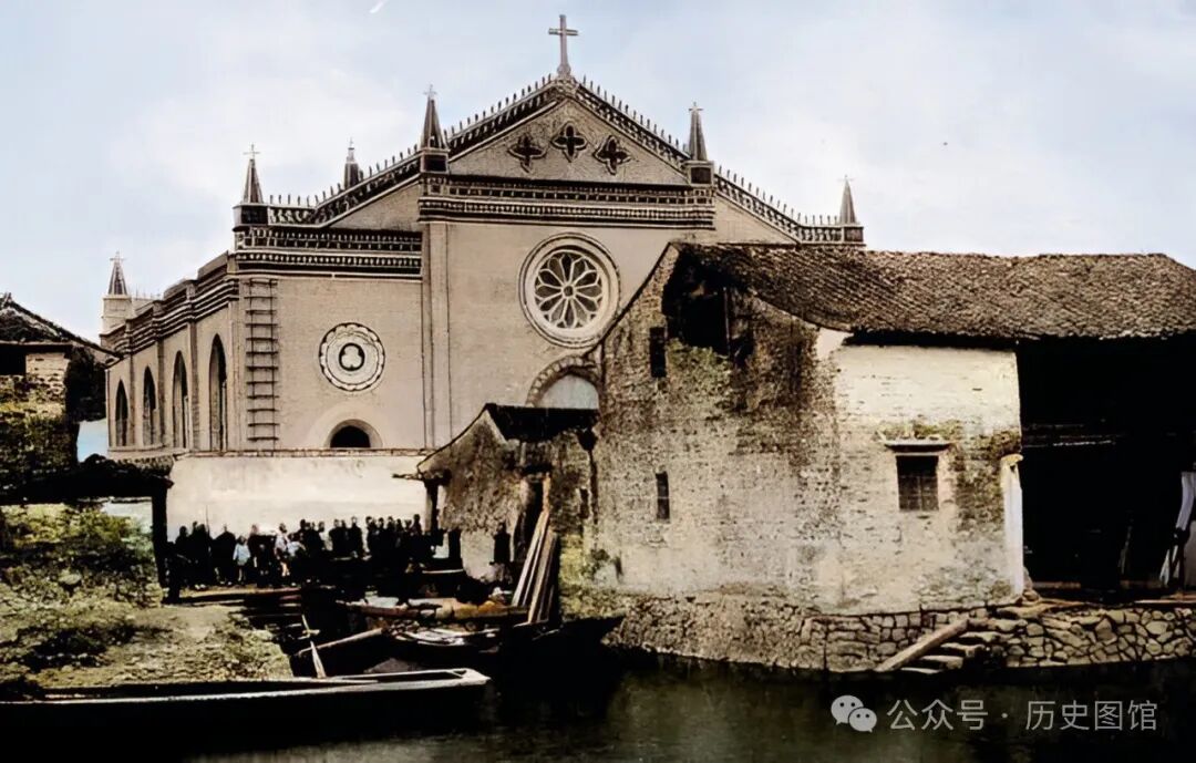 照片拍摄于1898年,教堂的正前方,有一个小码头,有很多人站在码头边等待上船。那时候,城西街还不存在。