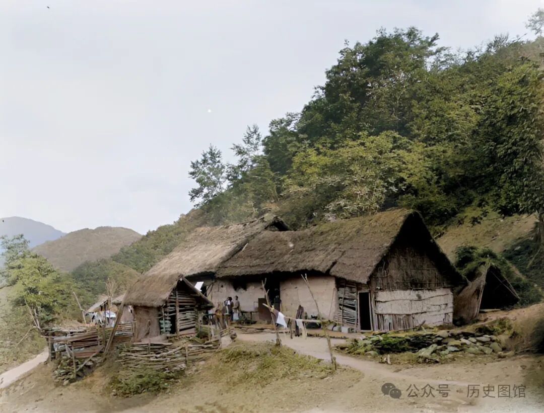 1910年6月11日,张伯林来到湖北省兴山县考察时,在半山腰处拍下了一户人家的几间草房。墙壁用泥坯垒砌而成,房顶覆盖的是茅草。远处的大山连绵不绝。