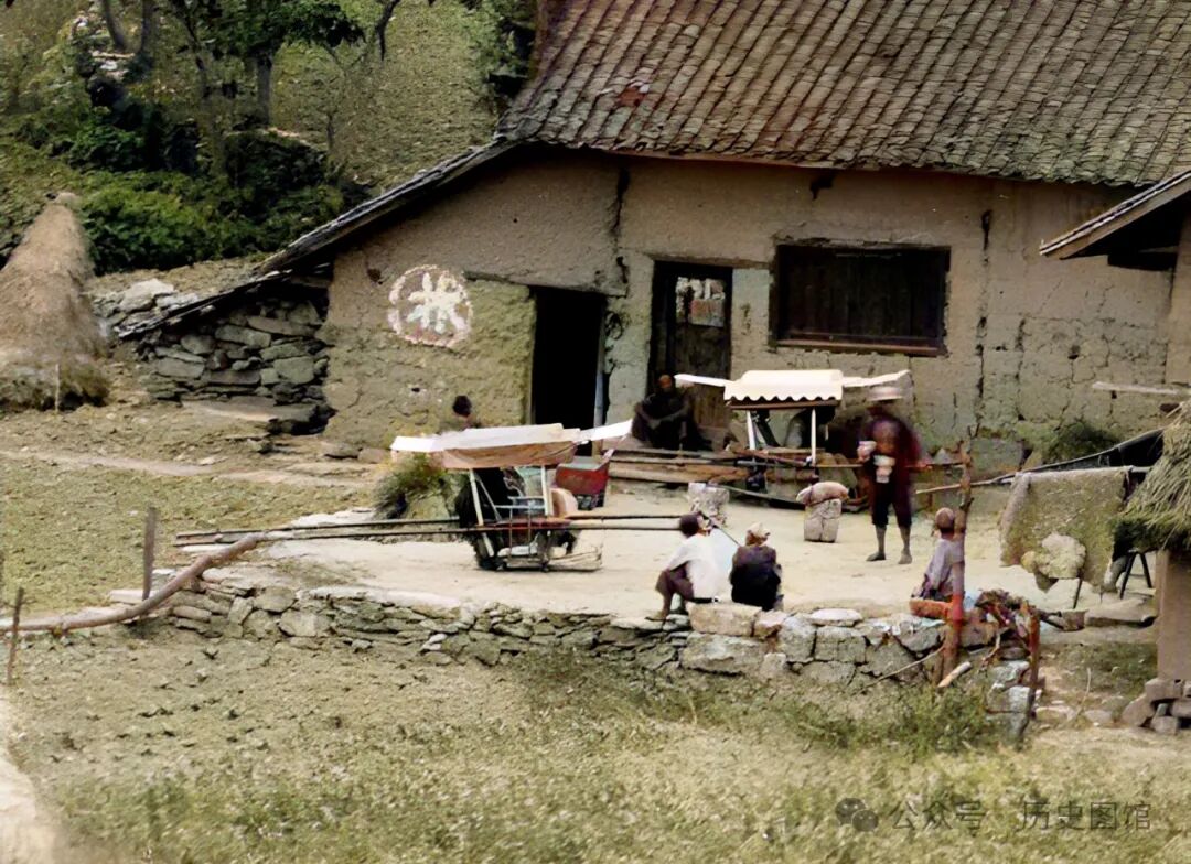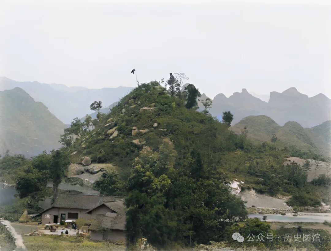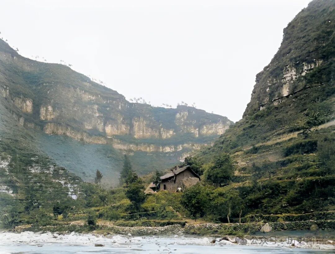 这张照片也是拍摄于今宜昌市夷陵区。照片中,在凸起的一座山包下,有一条河流。在河岸上,住着一户人家。房前停着两顶轿子,墙壁上那个白灰写的字到底是什么字呢?远处,青山在薄雾中,时隐时现,太美了。