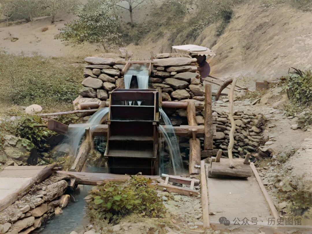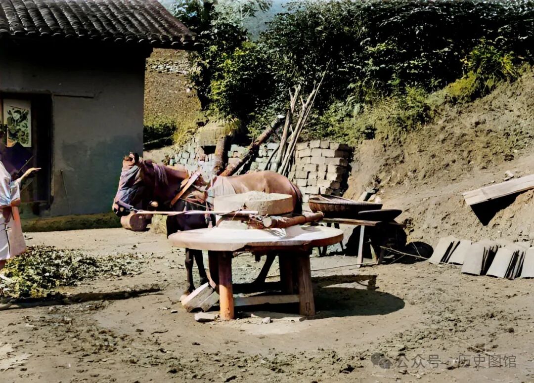 1910年6月,湖北省兴山县境内。一户人家房子前面,一匹马被蒙着眼睛,围着石磨转圈。马匹蒙上眼睛,一是为了防止偷吃米面,二是为了防止原地转圈头晕和被周围环境影响。现在,已经很难再见到这种传统的磨面方式了。