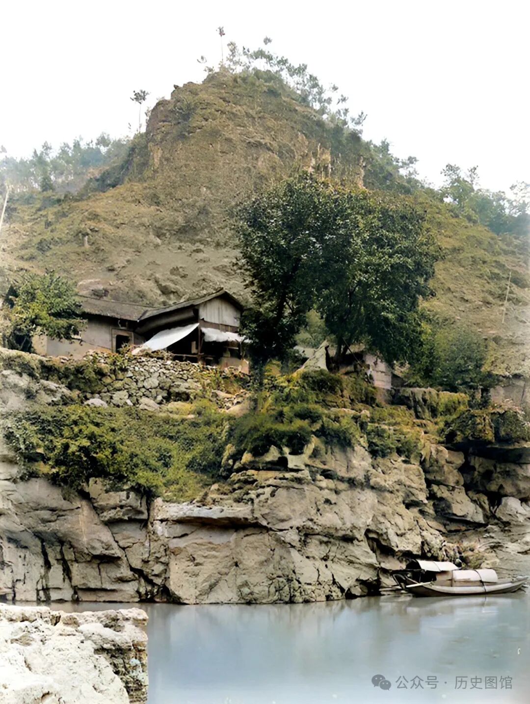 1910年,张伯林在今宜昌市夷陵区的下牢溪附近,拍下了这张照片。下牢溪发源于宜昌县的牛垭坪,溪水自北向南至南津关注入长江。溪水清澈,两岸奇峰竞秀,幽静自然。在山脚下,竟然住着一户人家,临水而居。