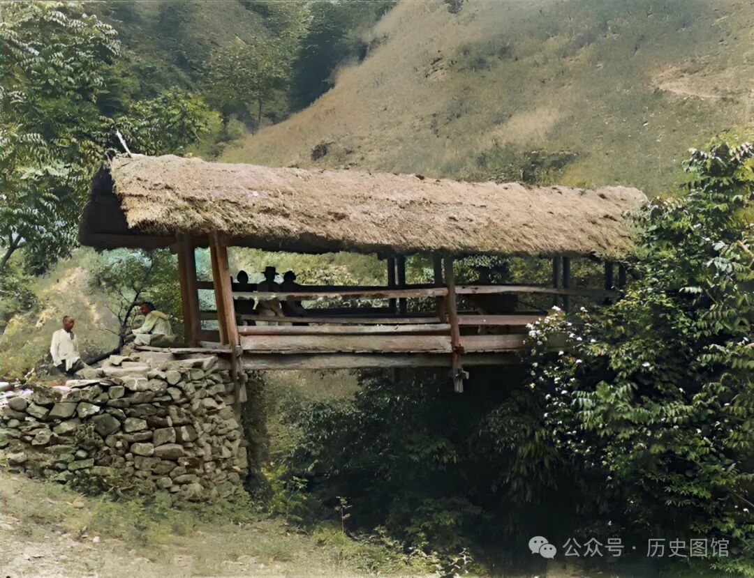 这是位于湖北省兴山县境内的一座廊桥。桥身用木头修建,桥上搭建有茅草顶。木桥横跨在一条小溪之上,几名路人正坐在桥上休息。这样的廊桥,能抵御风吹日晒,可以延长木桥的使用寿命。