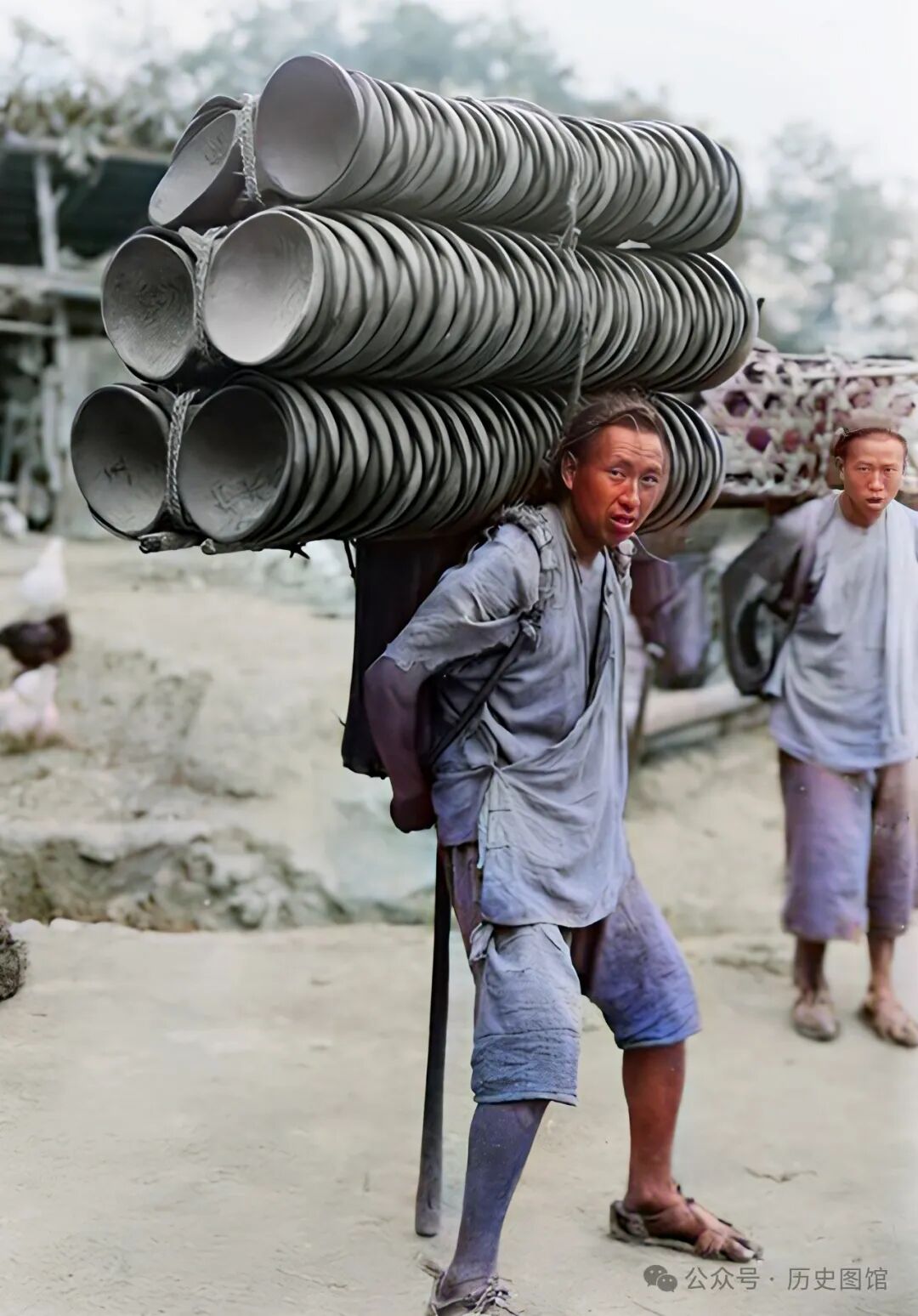 1910年,张伯林在湖北宜昌考察途中,遇到了几名背夫。他们肩膀上扛着很多当地手工制品,需要运送到山下。他们身后还带着一根木棍,休息时竖起来支撑着货物,这样就不用把货物卸下来了。