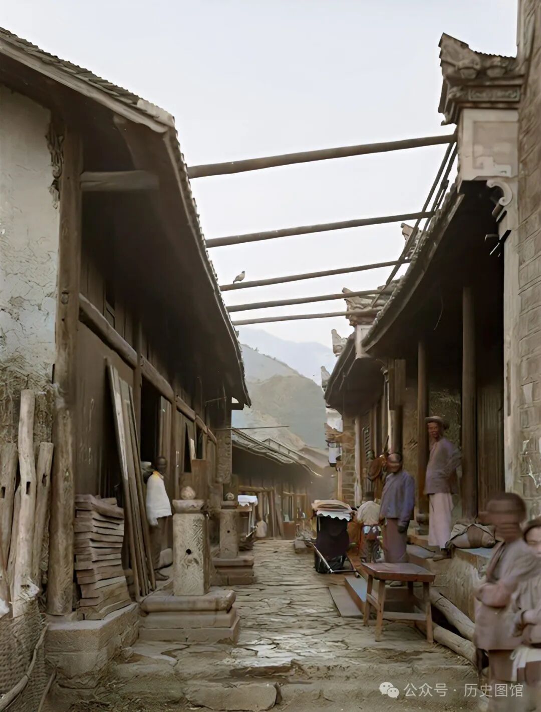 这张照片,拍摄于兴山县高阳镇的一条小街上。街道很窄,地上铺着石板。街道两侧的房屋古色古香,大部分店铺都在开门营业。照片右侧的房屋,推测是当地的衙门等机构。山门面阔三间,房前立有拴马桩,台阶下还停着一顶轿子。