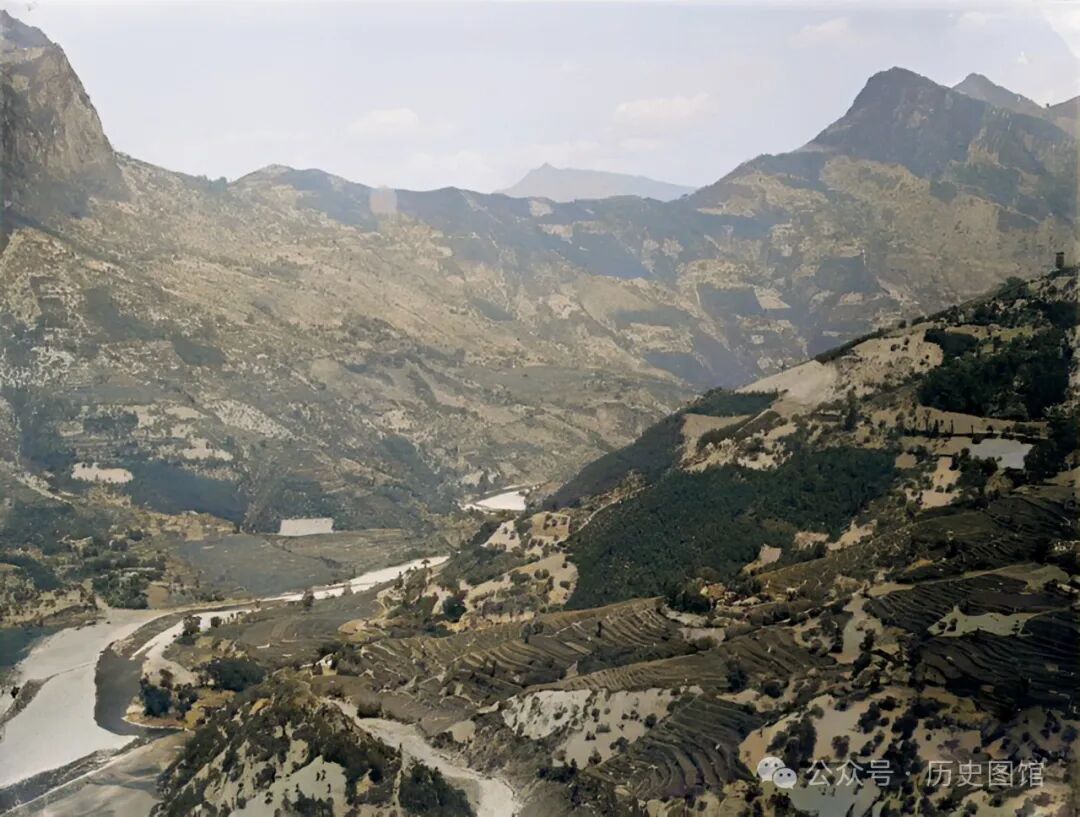 这张照片,拍摄于今湖北宜昌市夷陵区牛坪村附近。山坡和山谷中,布满了梯田。如今的牛坪村,是宜昌市夷陵区黄花镇下辖的行政村。牛坪村附近有南津关、三峡人家、三峡大瀑布景区、西陵峡口风景区、三游洞、三峡大坝旅游区等旅游景点。