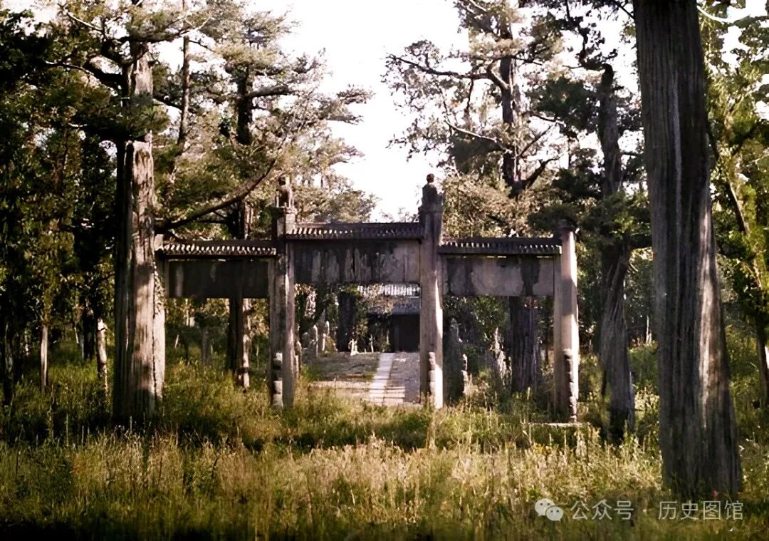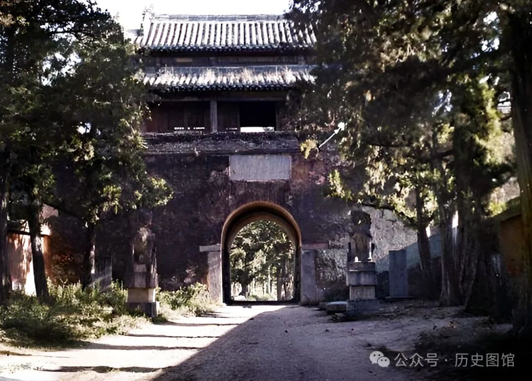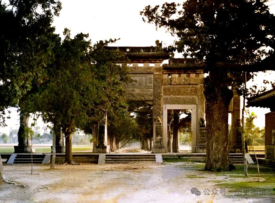100年前,孔林墓门前景象。孔林墓门位于孔林洙水桥北面,是孔子墓前甬道的大门。门面阔三间、悬山绿瓦顶,建于石台阶之上,两侧出八字墙。墓门为孔林内主要建筑之一,究竟建造于何时无法考证。墓门在孔林建筑布局中,起到了承前启后、至关重要的作用。