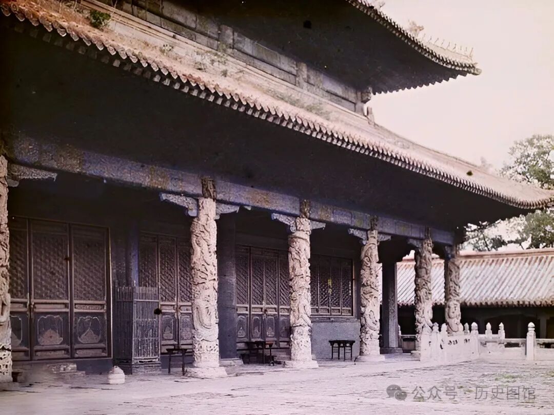 100年前,孔庙大成殿前景象。大成殿,是曲阜孔庙的主殿后设寝殿,也是孔庙的正殿。大成殿建于雍正七年(1729年)。大成殿面阔九间,重檐歇山,用黄色琉璃瓦。殿前檐有十根龙柱。柱子上雕刻着蟠龙及行云,非常气派。