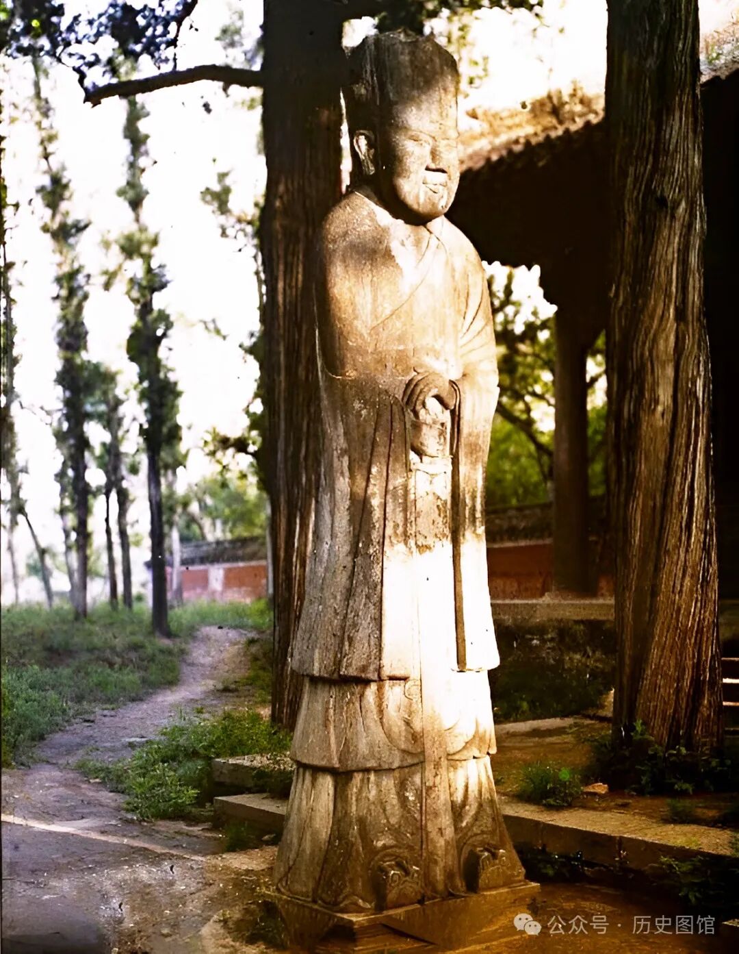 享殿前的甬道两侧,有四对石雕。分别为:华表、文豹、角端、翁仲。站在殿前的石人像分列左右,均称翁仲。文者执笏,武者按剑。