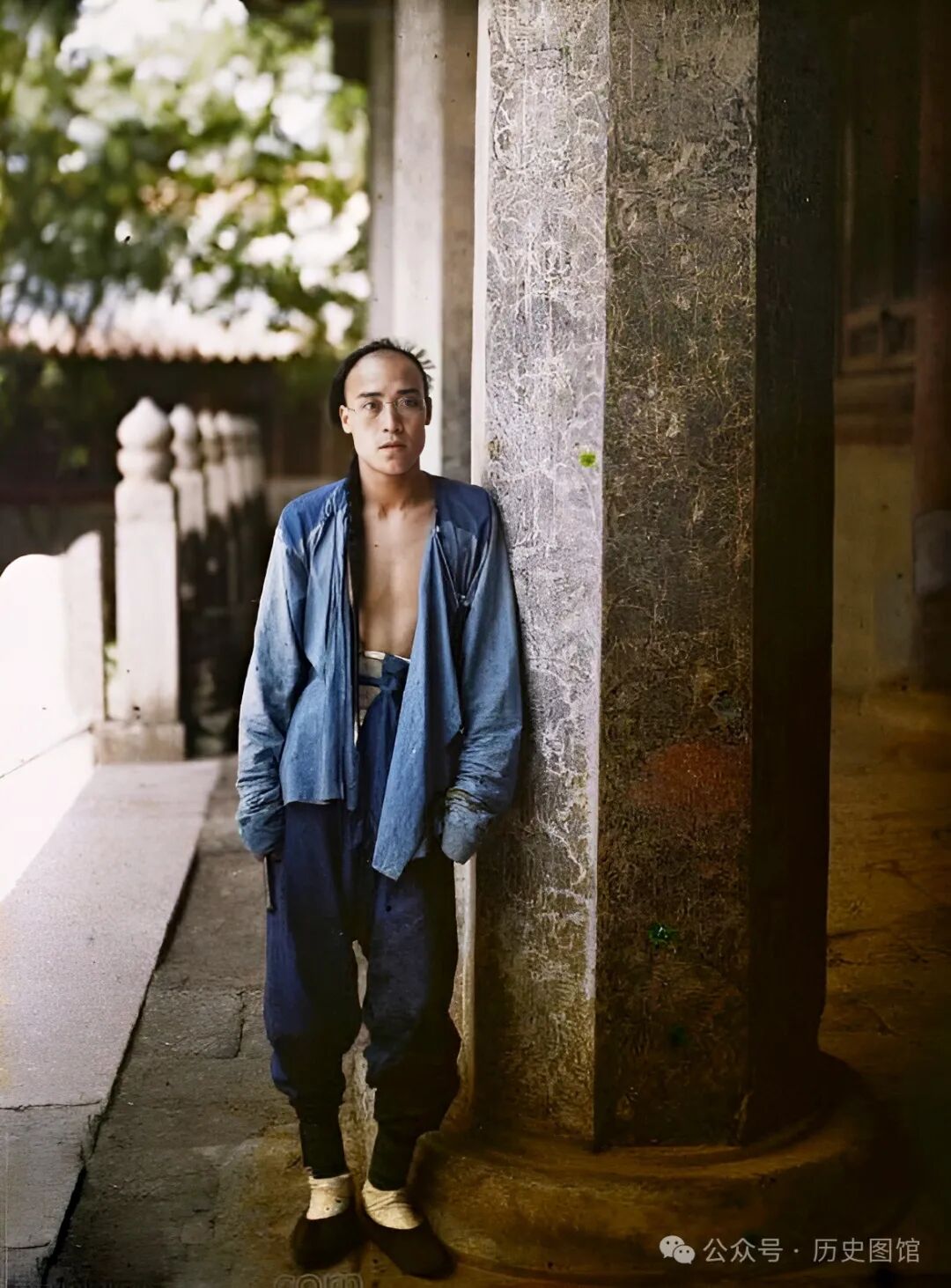 孔庙内,一名年轻男子站在柱子旁。他身穿当时的传统服装,肩膀上还有补丁,裤脚扎在一起。这身打扮,很有年代感。因为天气炎热,他敞开衣襟。他怎么也不会想到,自己帅气的容颜会被100多年后的人们看到。