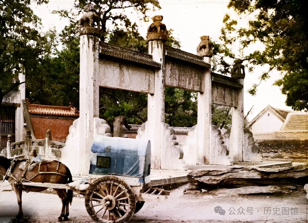 这是站在侧面看金声玉振坊,可以看到牌坊后面还有一座石拱桥。一辆马车停在牌坊旁边。这里有个很有意思的地方,牌坊上“金声玉振”的玉字。右下角的一点,却居中放在中间一横处。你知道这是为什么吗?