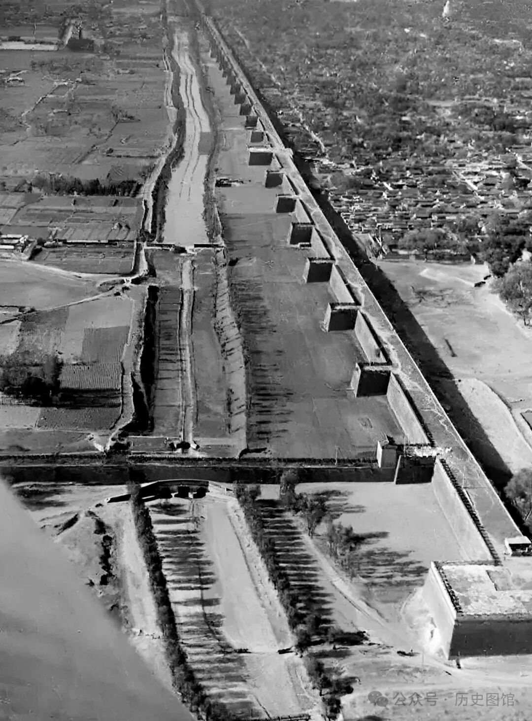 这是从400米高空中俯瞰北京西城墙。你一定从未在这个角度看过老北京的城墙吧?真是太雄伟、太震撼了!城墙上向外突出的敌台,一眼望不到尽头。城墙下有宽阔的护城河。