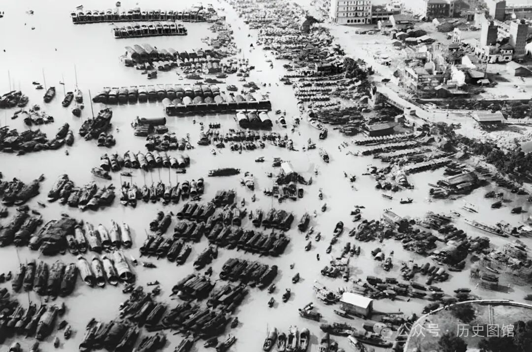 这张照片,拍摄于上海苏州河与黄浦江交汇处。苏州河上全钢结构建造的外白渡桥、乍浦路桥清晰可见。桥边的码头上,停泊着大大小小的船只。河面上船只,正排着队伍在驶出苏州河进入到黄浦江。