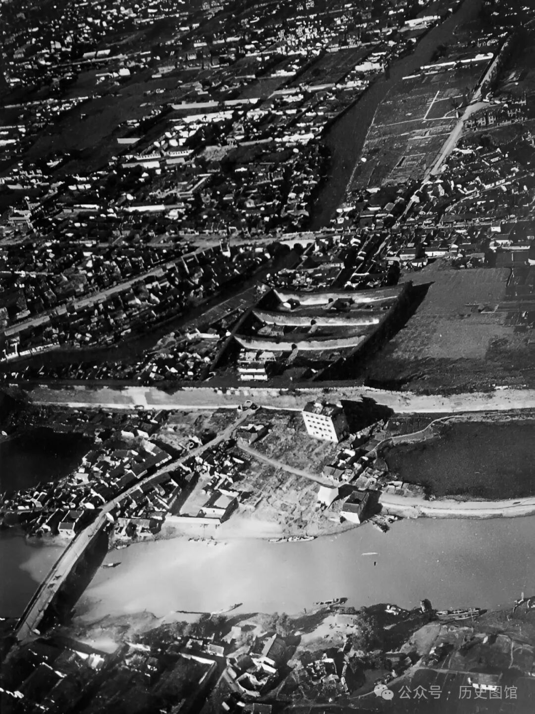 这是1937年的南京。日军占领南京后,也对南京城进行了航拍。当时的南京城,历经战火,变得满目疮痍。中华门是南京明城墙最著名的一道城门,有三座瓮城,四道门垣,被誉为“天下第一瓮城”。