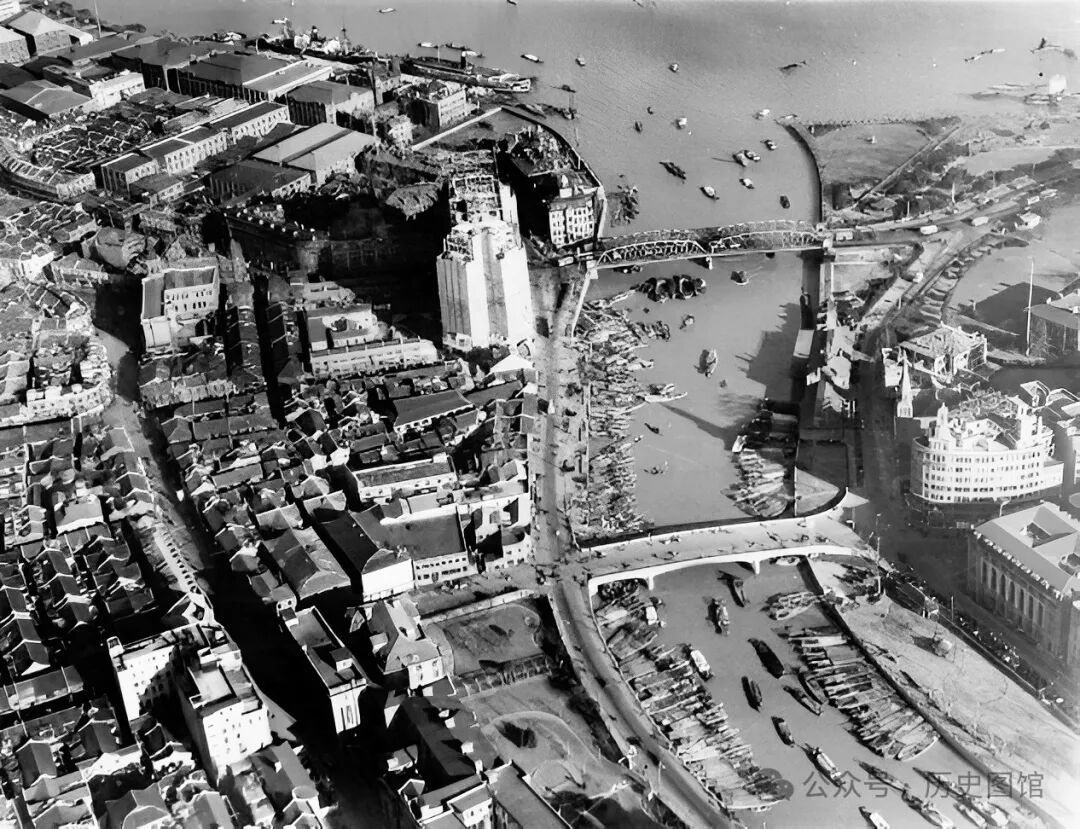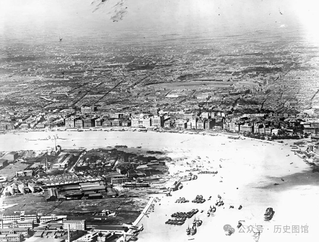 1933年,在飞机上看广州城。珠江岸边,停满了大大小小的船只。江面上,一艘艘小船来往穿梭。可见,当年广州的水上航运业何等发达。