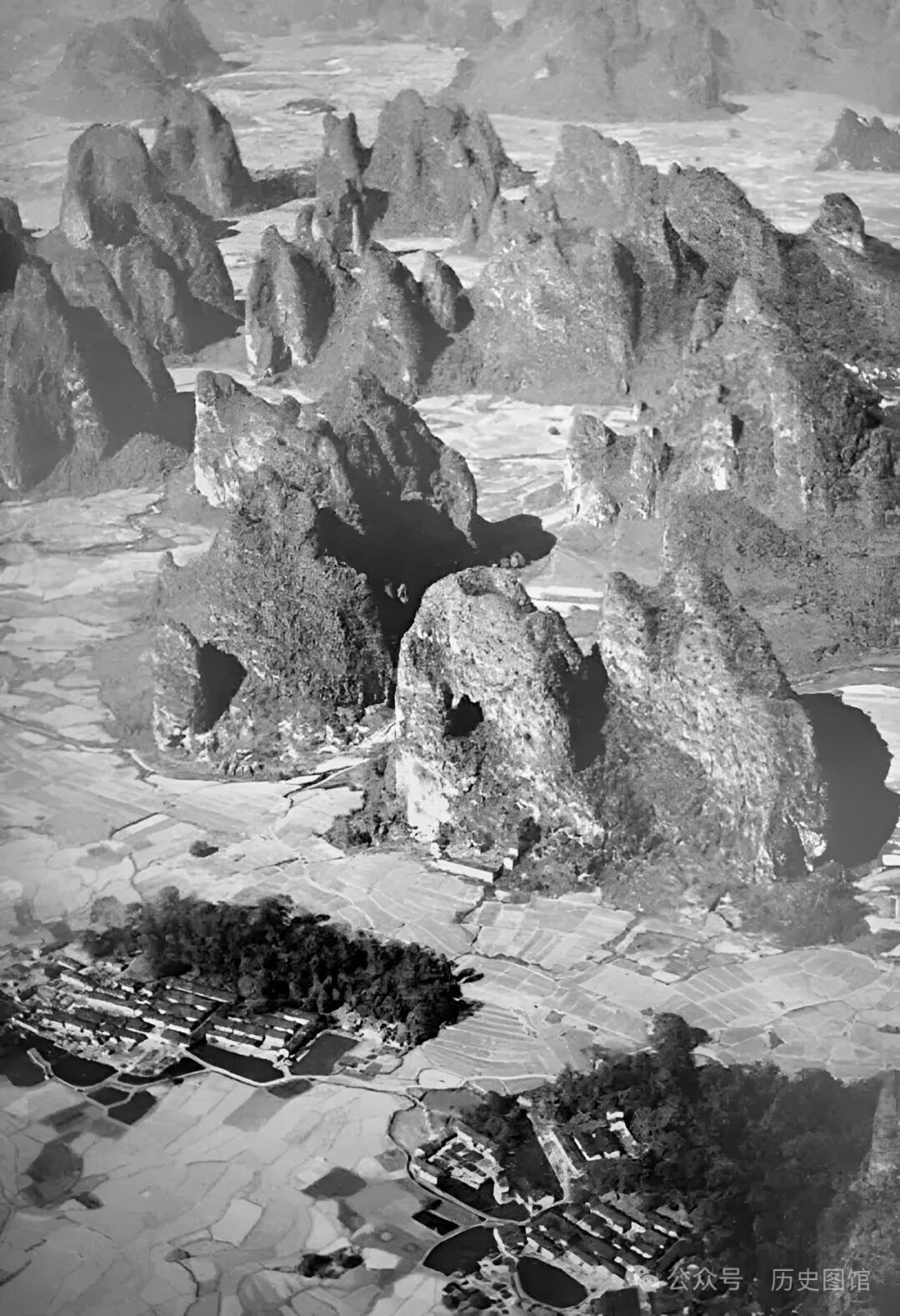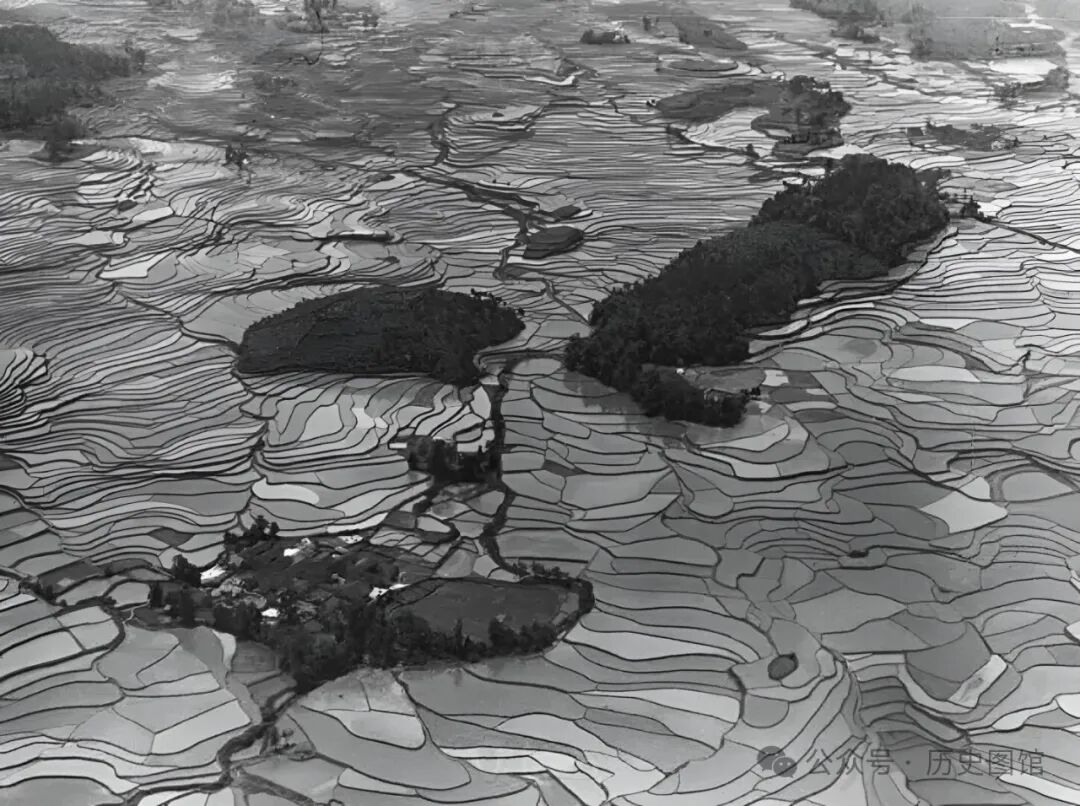 1933年,飞机航拍下的湖南。注满水的稻田,犹如一块块形状不规则的镜子,折射出不同颜色的天光。一些村庄,犹如绿色限额小岛,点缀在梯田中间,这画面真是太美了。