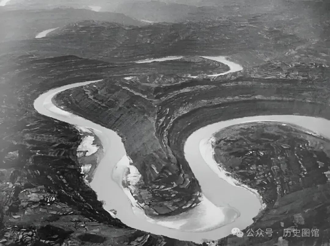1933年,飞机航拍下的四川嘉陵江面貌。江水坐在这里产生了一个优美的弯。嘉陵江是长江上游的一条支流,向南流经四川,最后汇入长江。