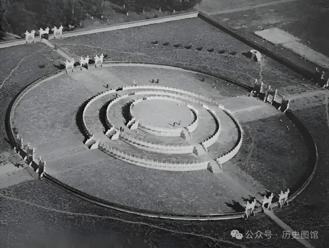 这是在100米高度拍摄的圜丘坛。这是一座三层露天圆台,别名祭天台。始建于明朝嘉靖九年(1530年),是皇帝冬至日祭天大典的场所。圜丘坛中间圆形,四周方形,象征天圆地方。从这个角度看,更能感受到这个地面奇观。