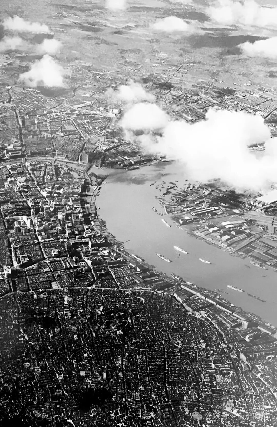 在2500米高空航拍的上海,云朵漂浮在城市上空,黄浦江上,大小船只来往穿梭。。前景为南岛,后景为闸北和虹口。城区建筑密密麻麻,当时的高楼还没有现在多。30年代的上海,已经显现出了大城市的繁华景象。