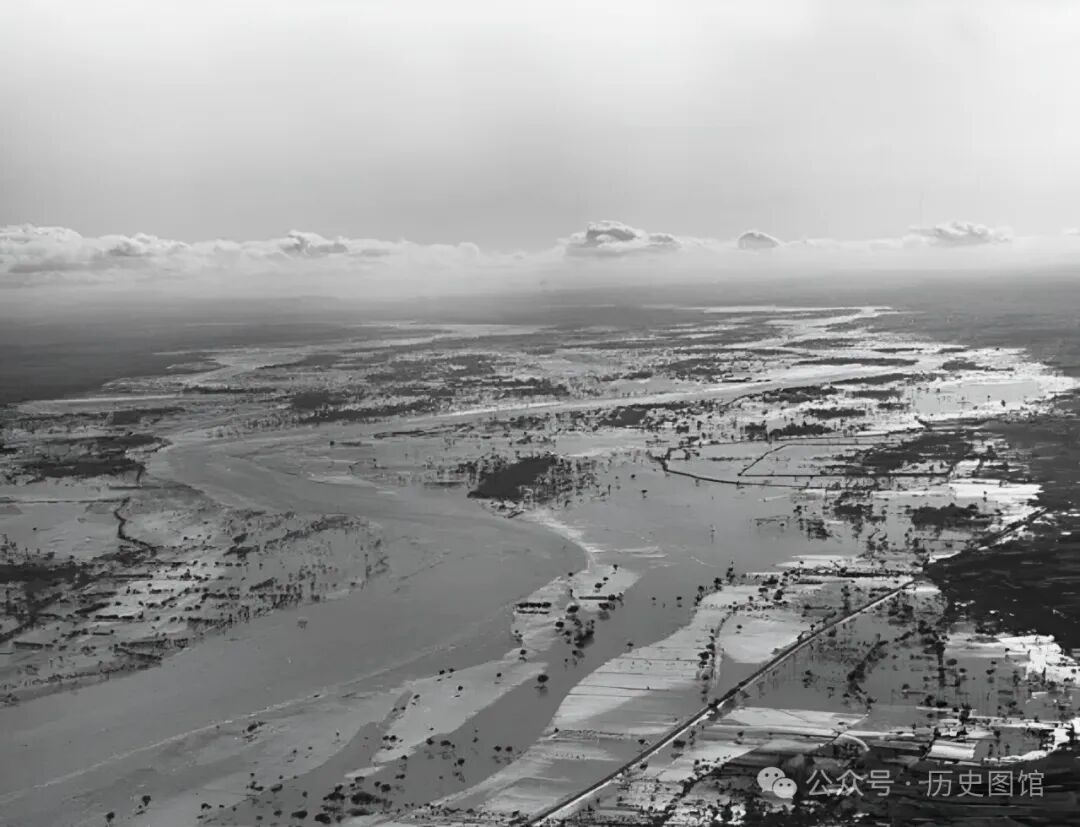 1933年,河南洛阳航拍照片。当时,洛河发生洪水,河水漫上堤岸,淹没了附近的农田和村庄。飞行员拍下了这一幕。在照片的右下角,能清晰看到洪水中一条铁路线。那是郑州-洛阳的铁路线,火车已经全线停运。