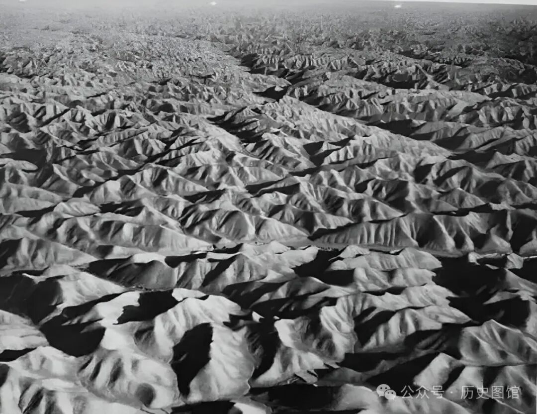这张航拍照片里,出现了十分奇特的地貌。这就是位于兰州以北约100公里处的甘肃黄土山区。高低起伏的黄土地,是千万年来大自然的杰作。从高空中俯瞰,令人惊叹。