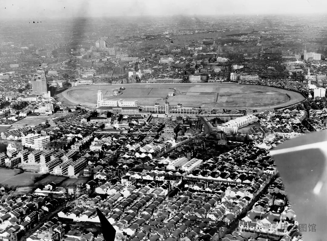在这张上海航拍照片中,远处的地面上,赫然出现一个巨大的椭圆形场地。那就是当时上海的跑马场,也叫跑马厅。过去的上海,有三处跑马场,均跑马场位于公共租界。照片中这处跑马场位于南京西路。跑马场边有巨大的跑马厅大楼,主建筑有4层,钟楼高8层。