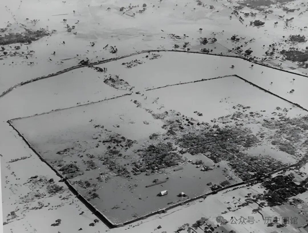 30年代,河南洪水肆虐后的河南偃师。古城内的建筑全部淹没在水中。城池外面也成了一片泽国。房屋、树木和农田,全都浸泡在水中。这画面让人看了心碎。