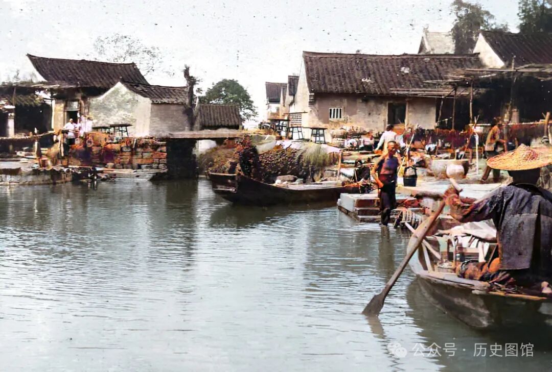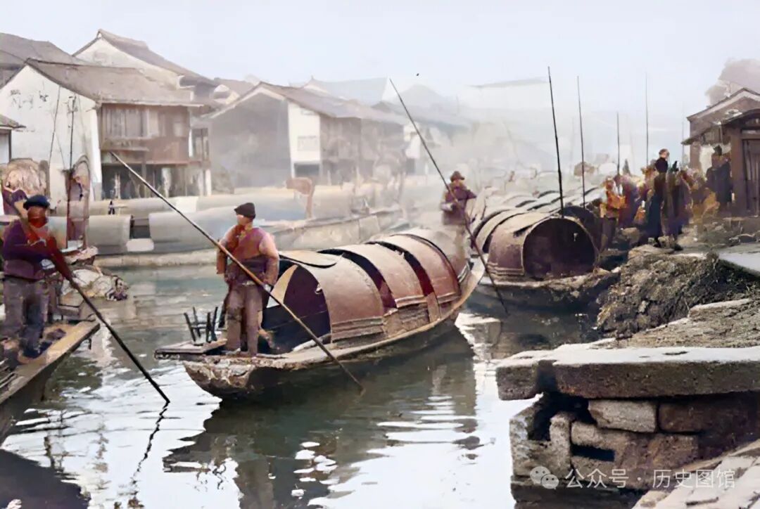 30年代,绍兴城内一座小码头上的景象。码头边上停着很多乌篷船。烟雨朦胧,小桥流水。几名船夫用竹篙撑着小船驶过河道。岸边是绍兴传统的民居建筑,古色古香。