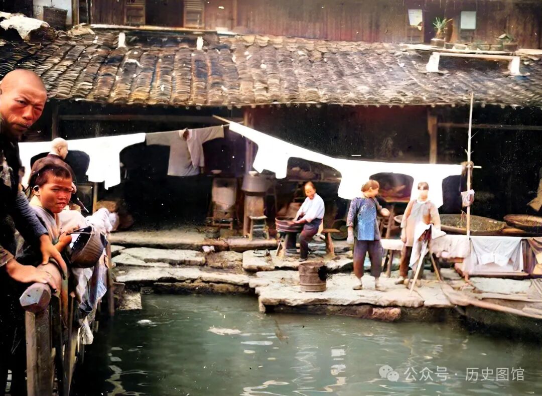 绍兴是一座别致的小城。照片中,几户人家临水而居,几名妇女在晾晒衣服,人们站在桥上看热闹。房前就是水,水上有木桥,家家户户枕河而居。