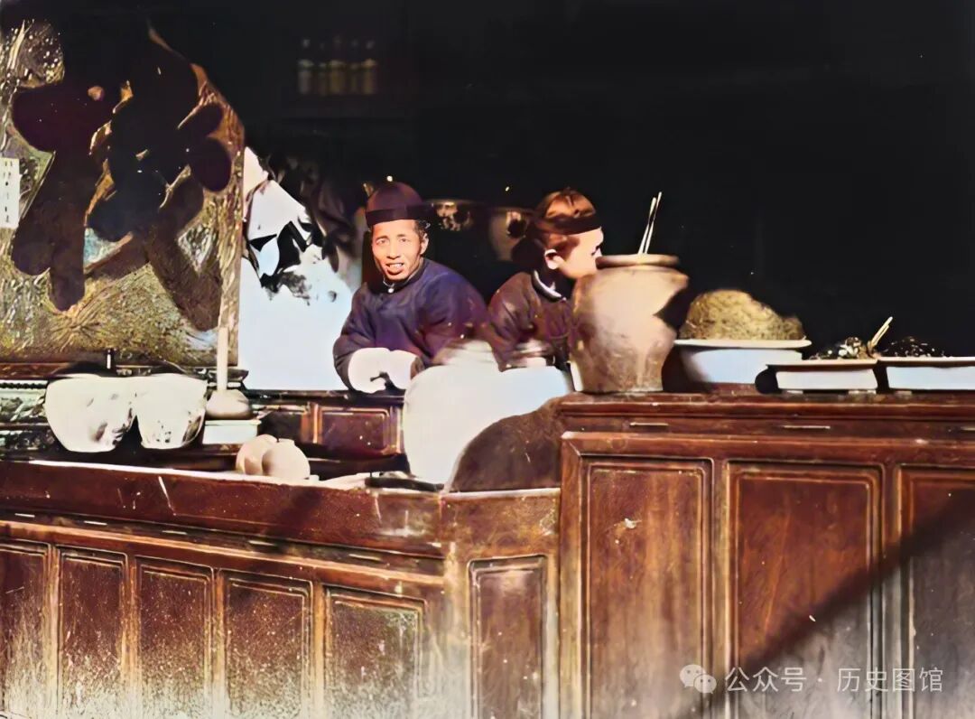 这是30年代绍兴城内的的一个客栈。旁边额墙壁上,斜着有一个巨大的“栈”字。两名伙计正站在柜台后面,柜台上还摆放着一些食物。看到有人拍照,一名柜台后面的伙计,脸上露出好奇的表情。