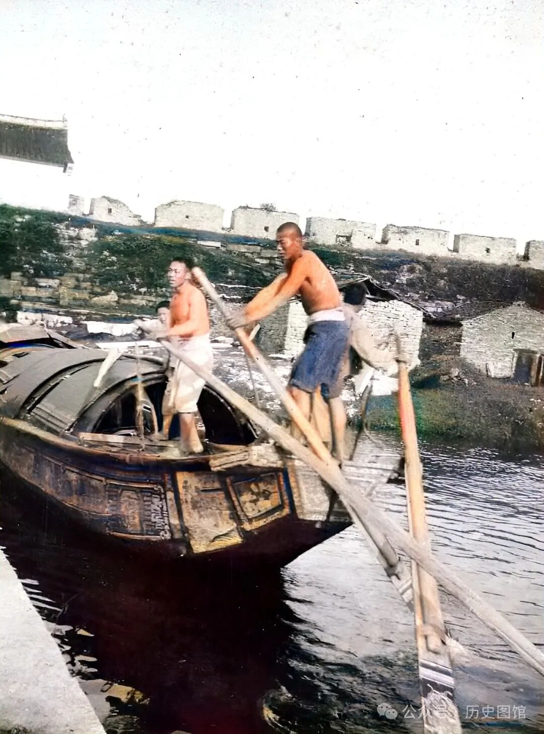 30年代,绍兴城外,几名船夫正划着桨,驾驶乌篷船通过水门进城,船上装满了货物。艄公揖桨摇橹,听着水声潺潺,好不惬意。