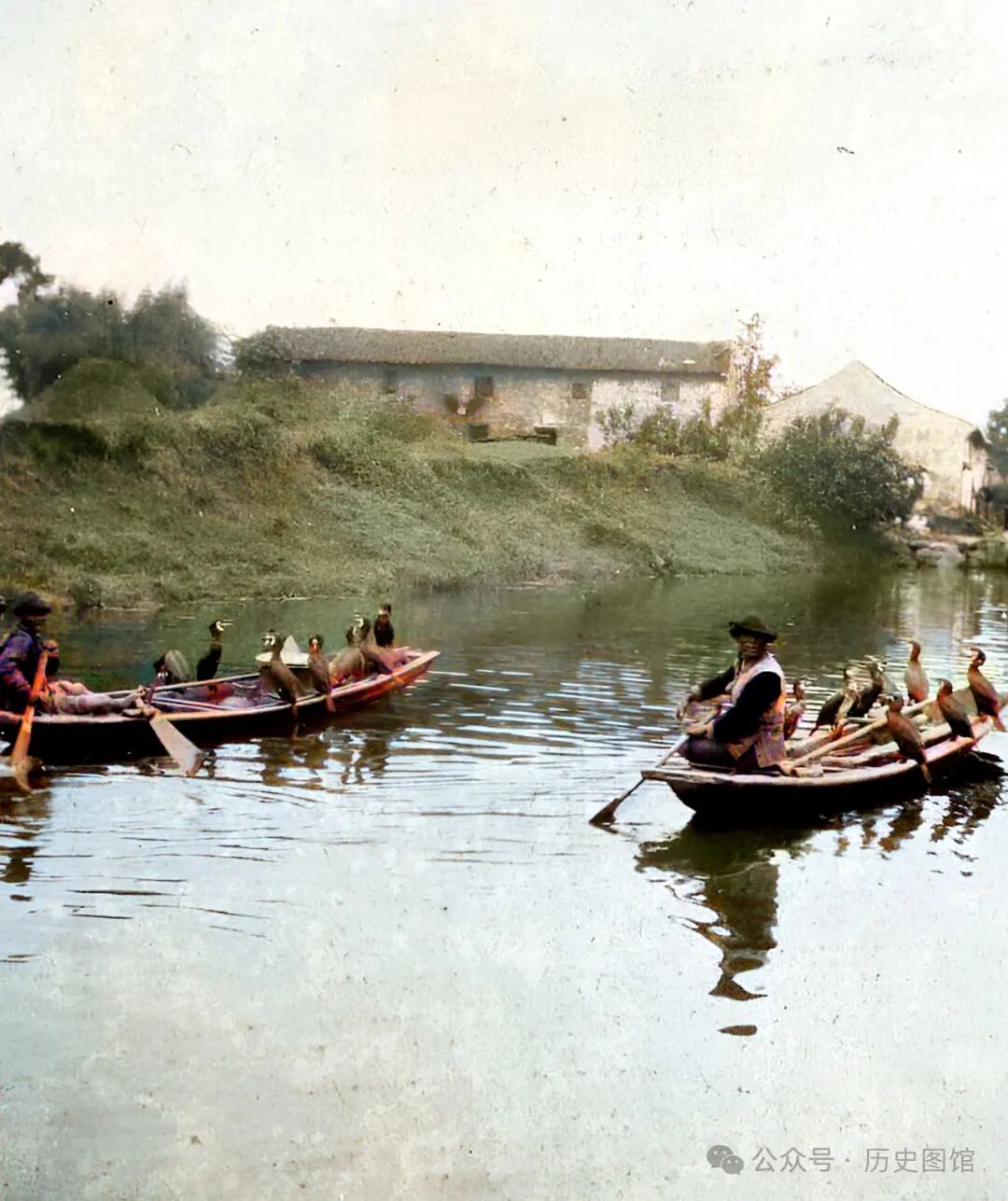 30年代,绍兴一条小河里,两名渔夫正驾驶小船捕鱼。两只船的船舷上各站着七八只鸬鹚。鸬鹚的脖子上套着绳子,下水捉到鱼后,渔夫就可以把鱼取出来。这是一种传承了上千年的捕鱼方式,现在已经很少能见到了。
