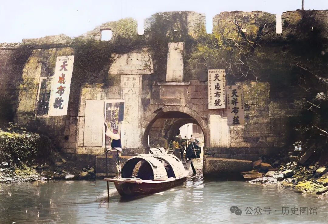 这座城门建在水道之上,这就是当年绍兴的东郭门,城门洞下可通行船只。自古以来,绍兴水路交通比较发达。照片中,一名船夫站在船头撑起竹篙,乌篷船正在通过城门洞。