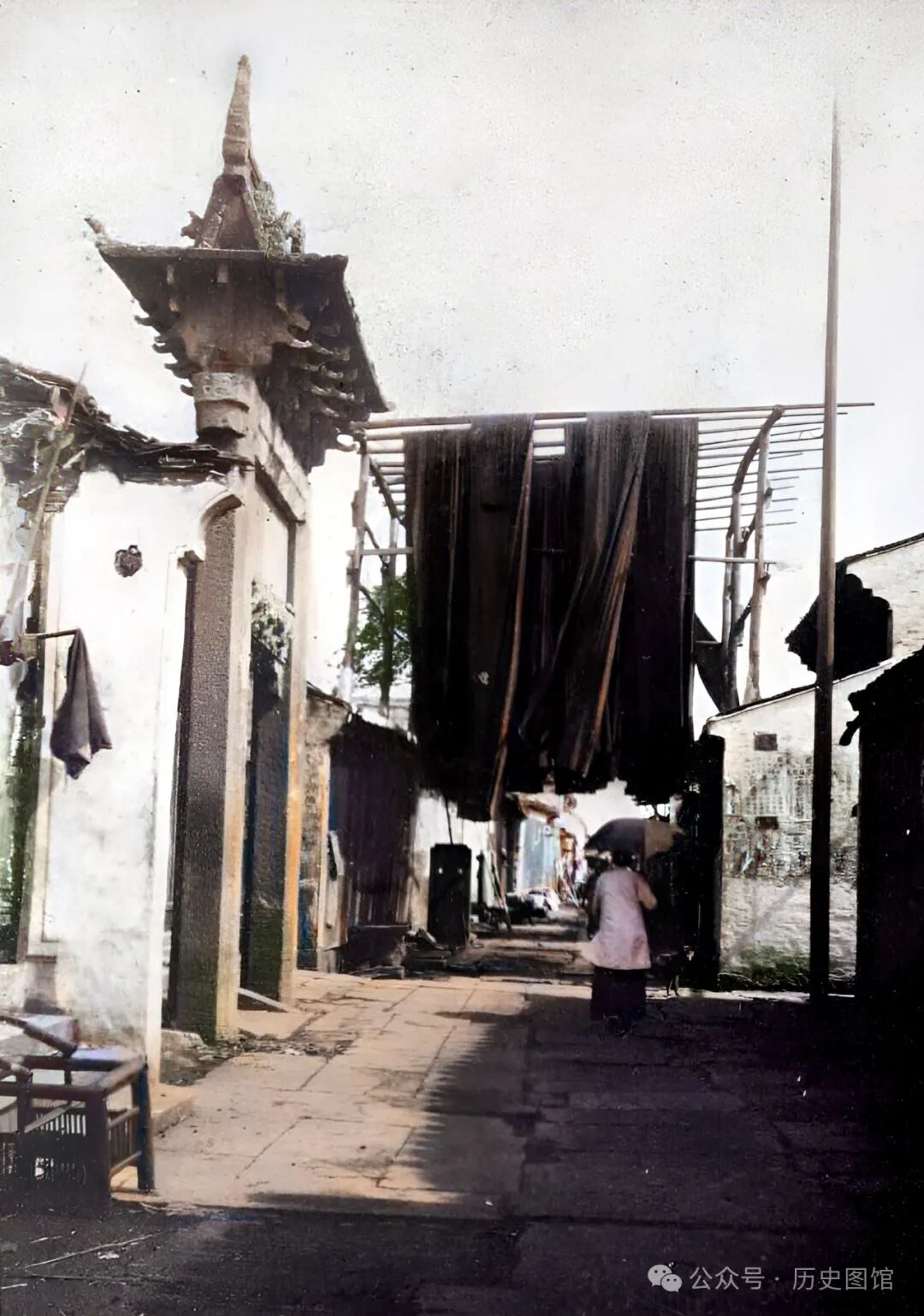30年代,绍兴城内一条小胡同里的情景。胡同很窄,的路面铺着石板。小巷里有一个染布作坊,染好的布匹,挂在小巷上面的横木上晾晒。