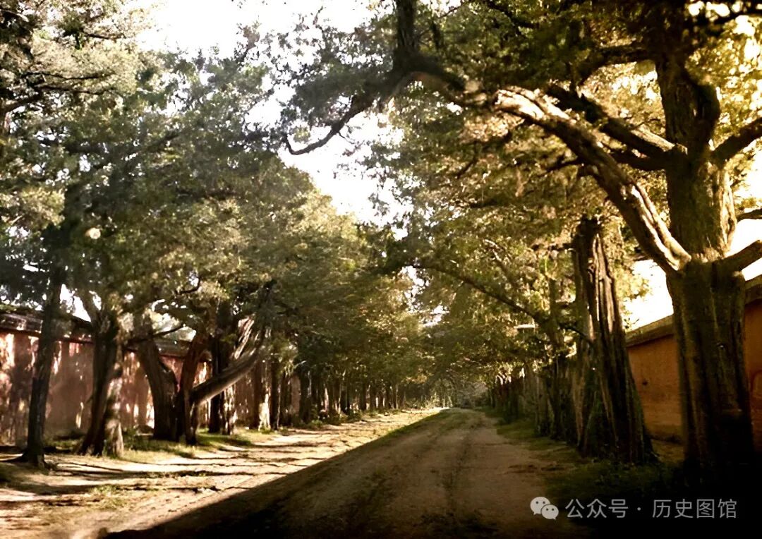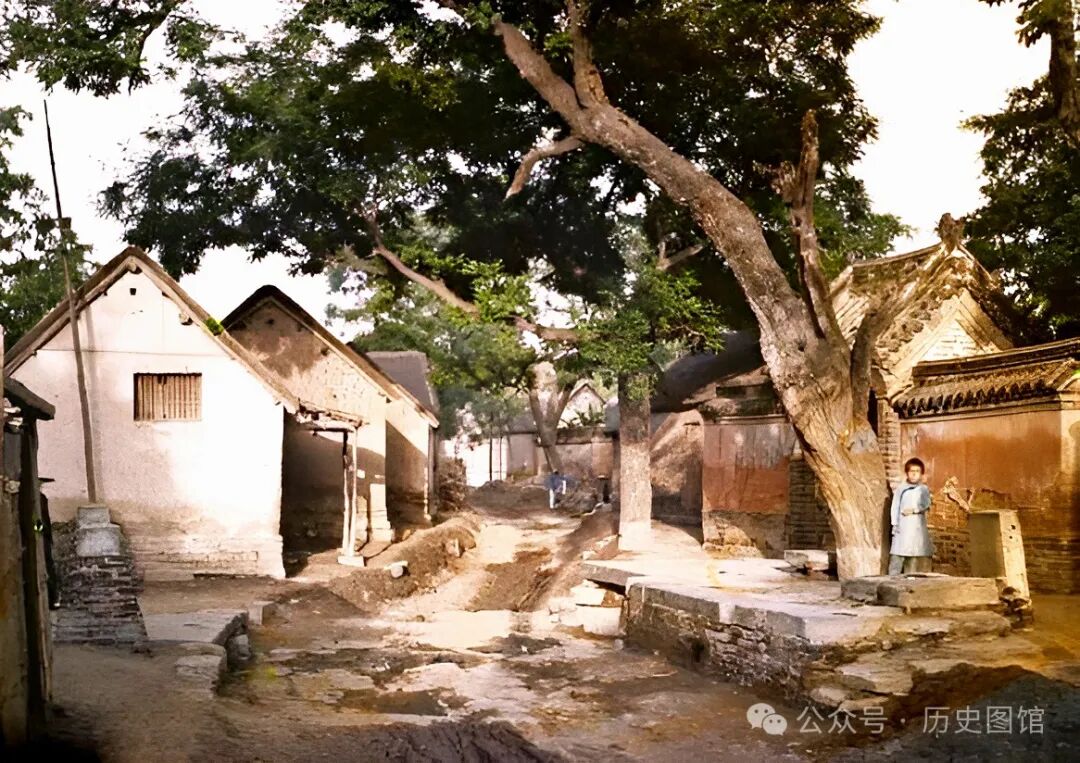 100多年前,曲阜城内一条位于寺庙后面的小街景象。路面的大树下,有一口水井。一个孩子站在井台旁边。红墙、绿树、阳光,照片中的颜色真是太漂亮了。