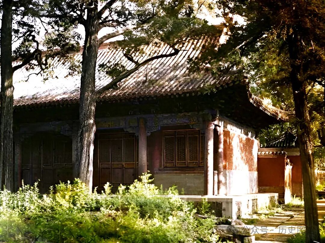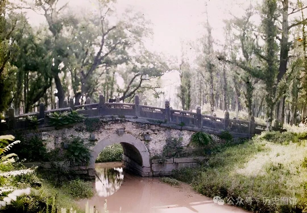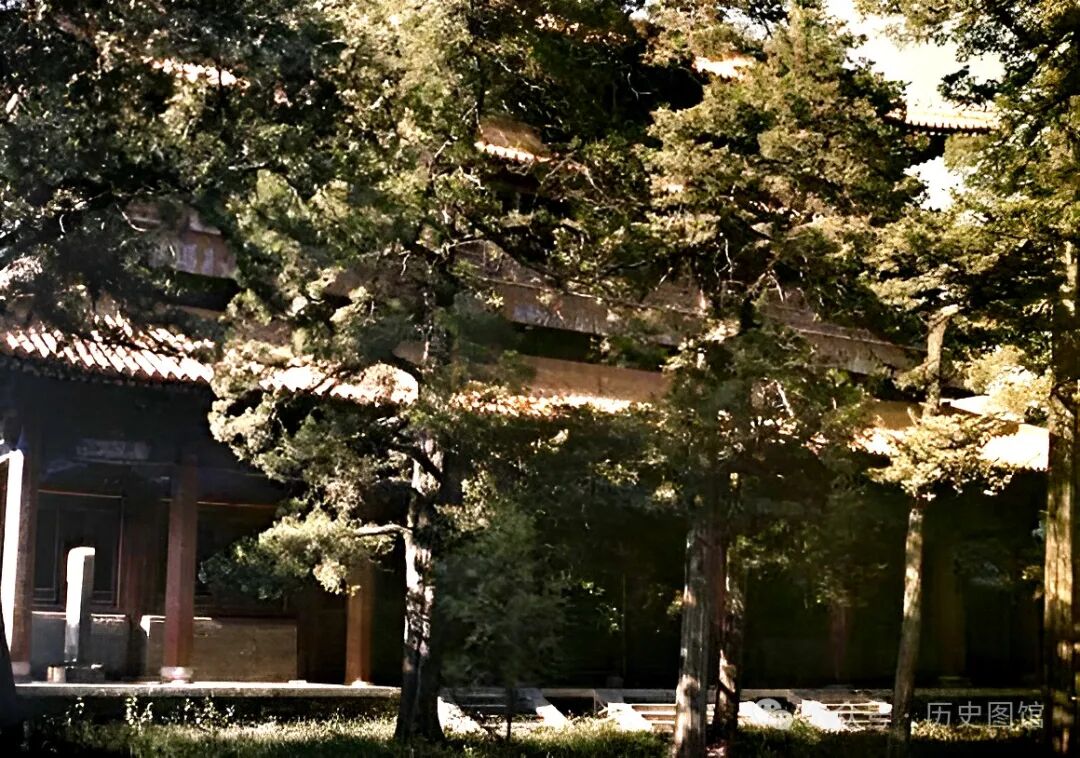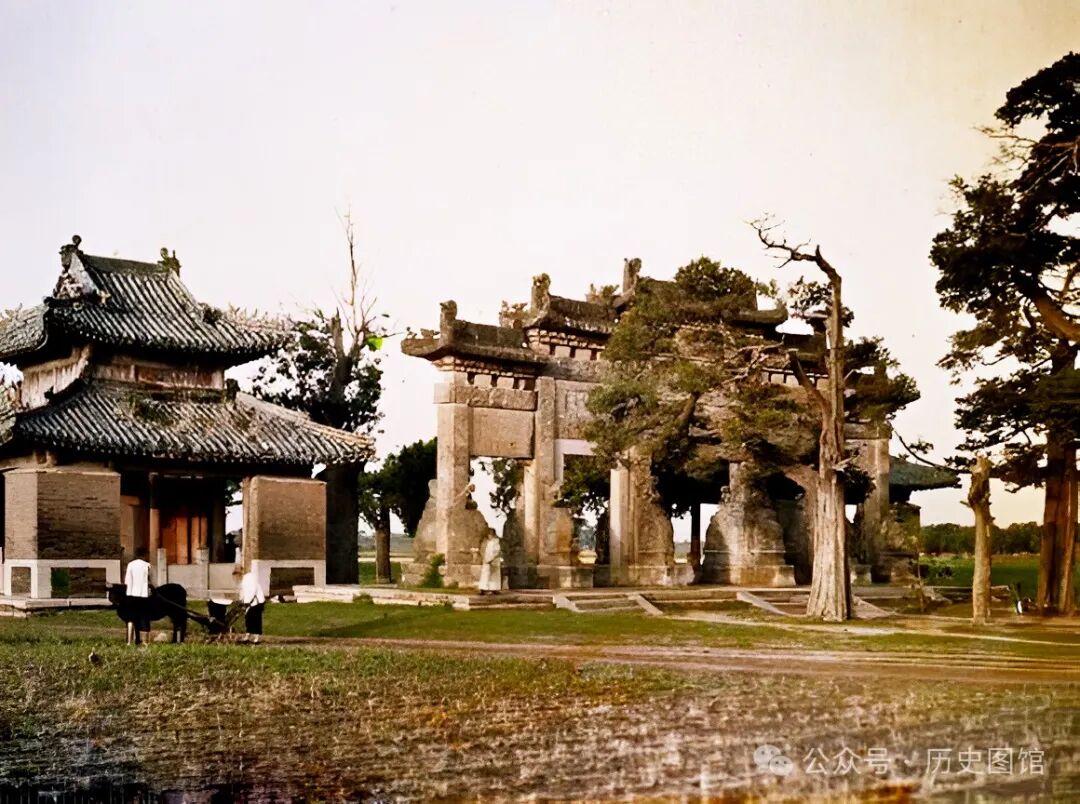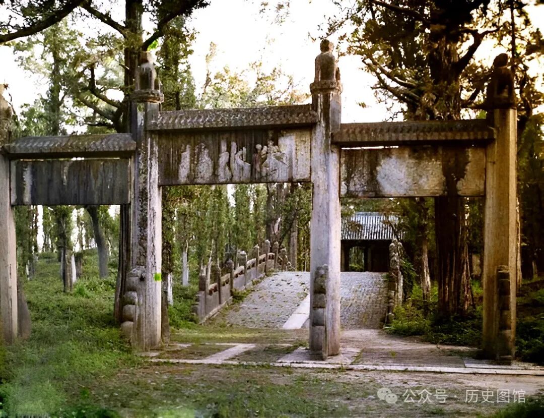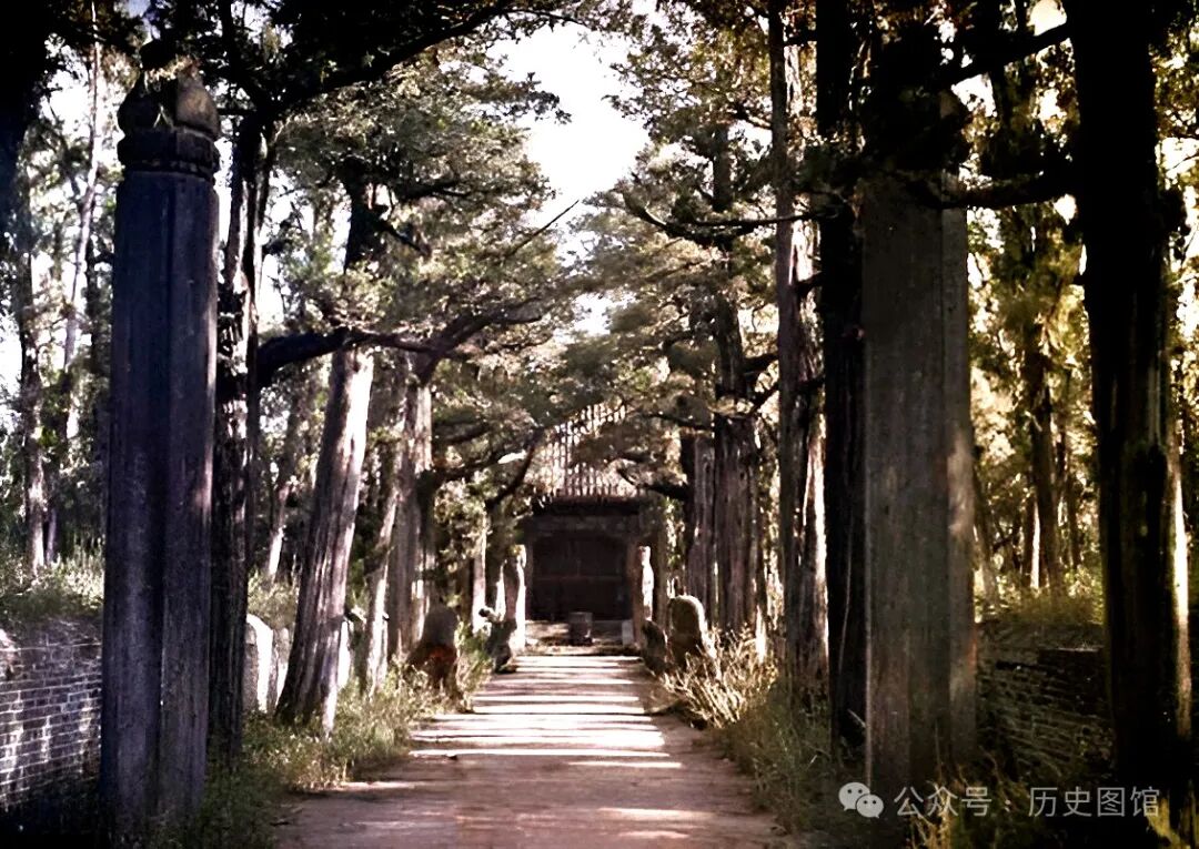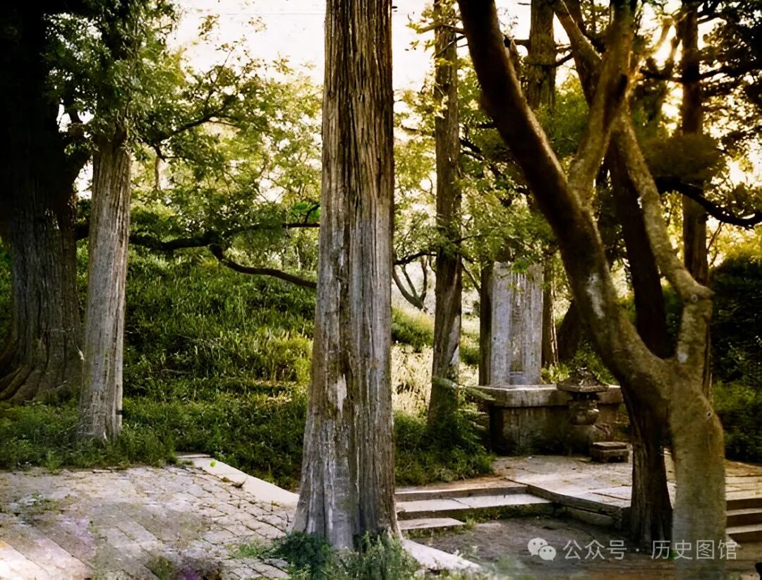 在石碑的前面,还有石供案、石鼎、石酒池和石砌拜台。和现在相比,当时的墓冢前还没有砖砌花棂围墙。墓冢四周绿树苍翠,十分幽静。
