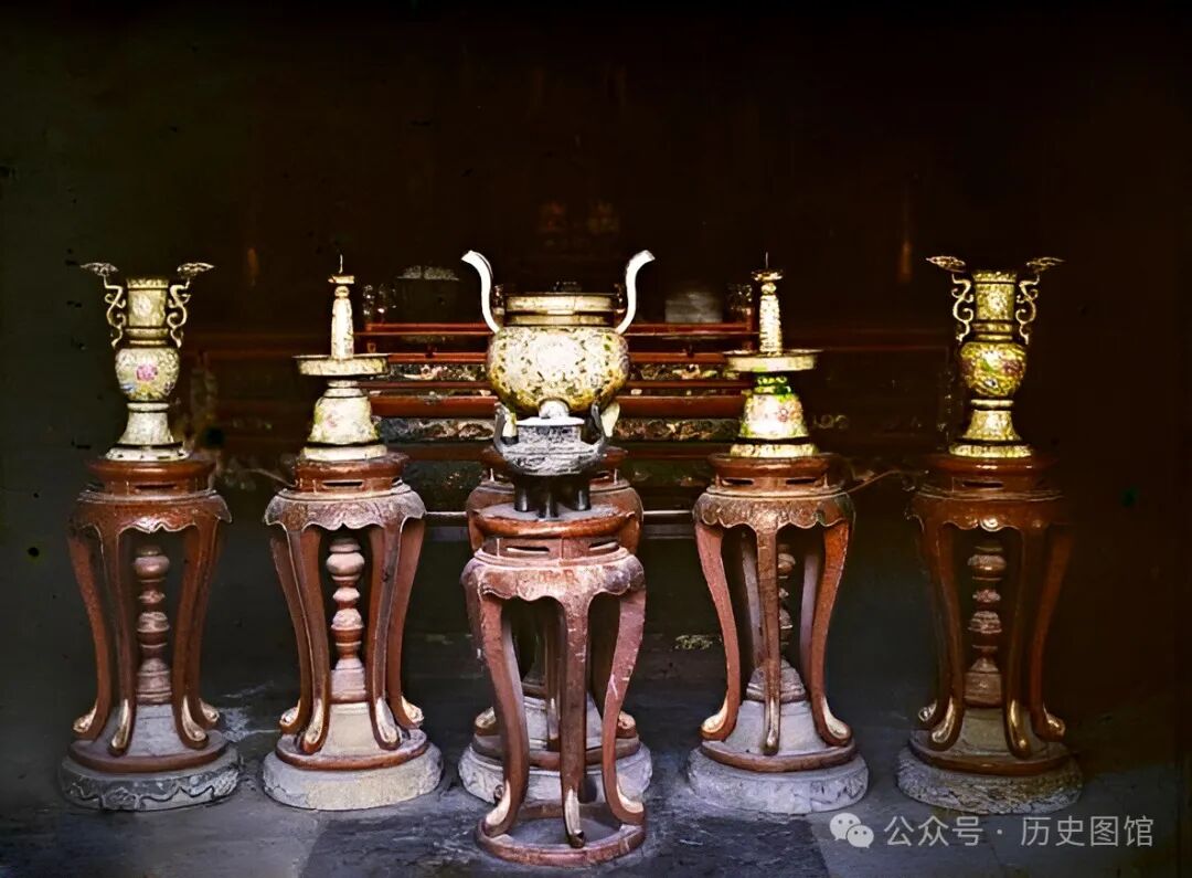 大成殿内孔子塑像前摆放有供桌、香案、摆满祭祀时使用的笾、豆、爵等礼器。木制的底座,雕工精美,底座上五个不同样式的铜制礼器,中间为鼎,左右对称。