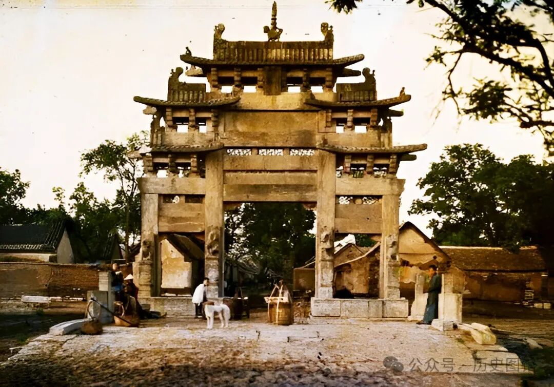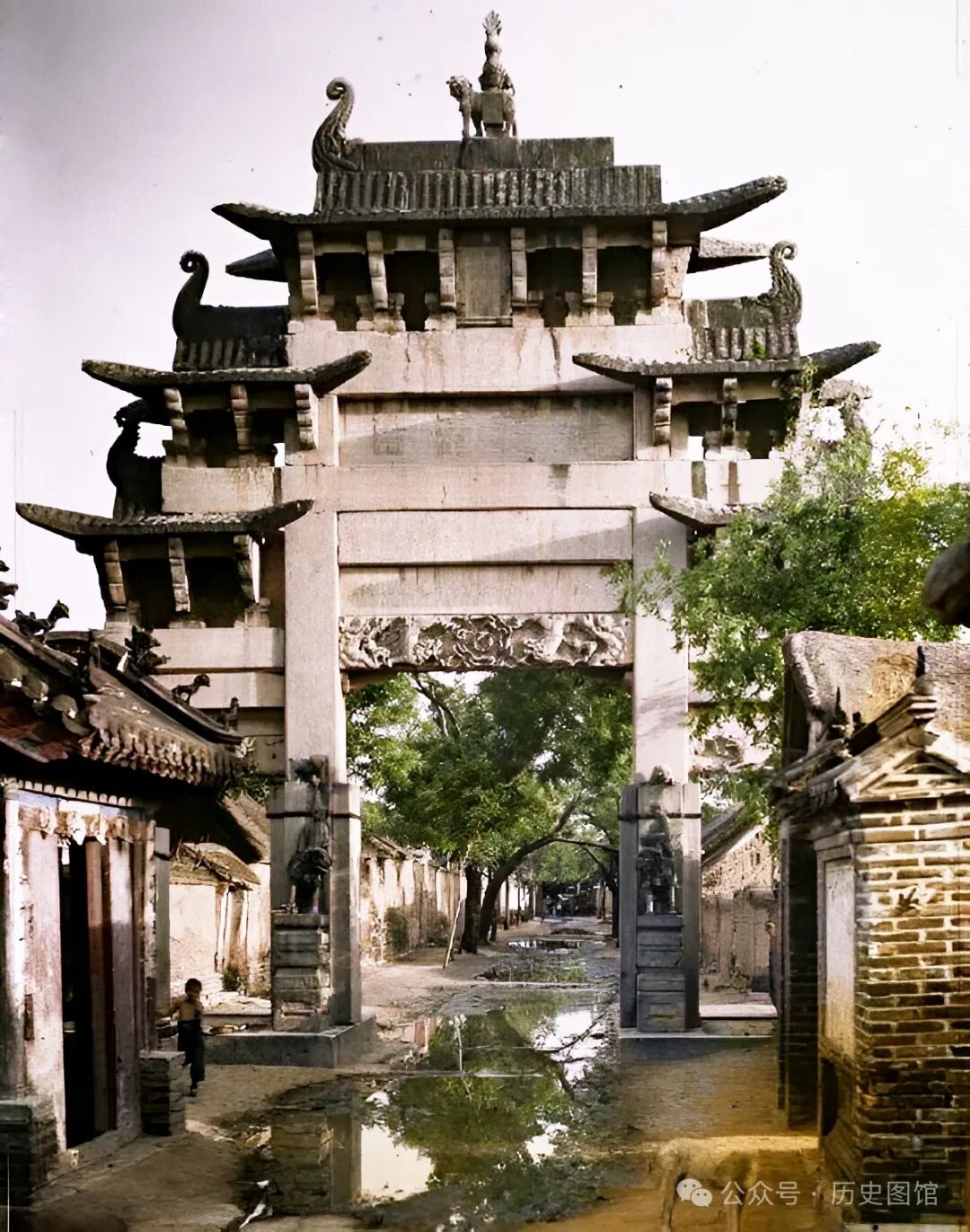 1912年,位于曲阜城内一条街道上的石牌坊。这是一座三间四柱五楼的石牌坊,横梁上雕刻着精美的花纹。从这个位置看上去,非常高大壮观。