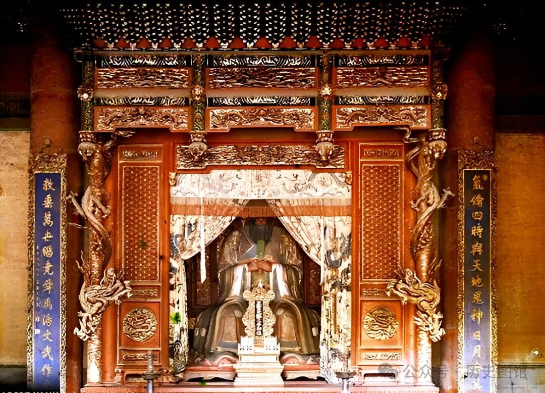 这是孔庙大成殿内,至圣先师孔子的塑像。孔子像头戴十二冕旒,身着十二章服,凛然独立。塑像前的木牌上,写有"大成至圣先师之位"。左右一副楹联:气备四时与天地日月鬼神合其德;教垂万世继尧舜禹汤文武人之师。