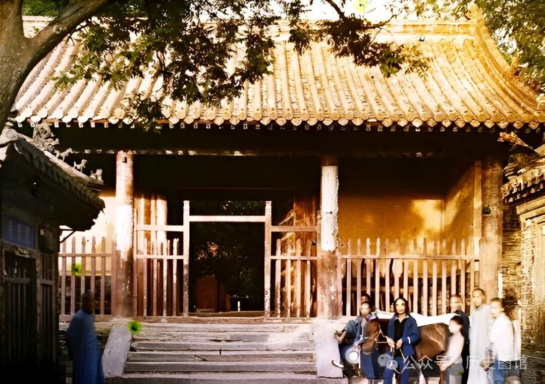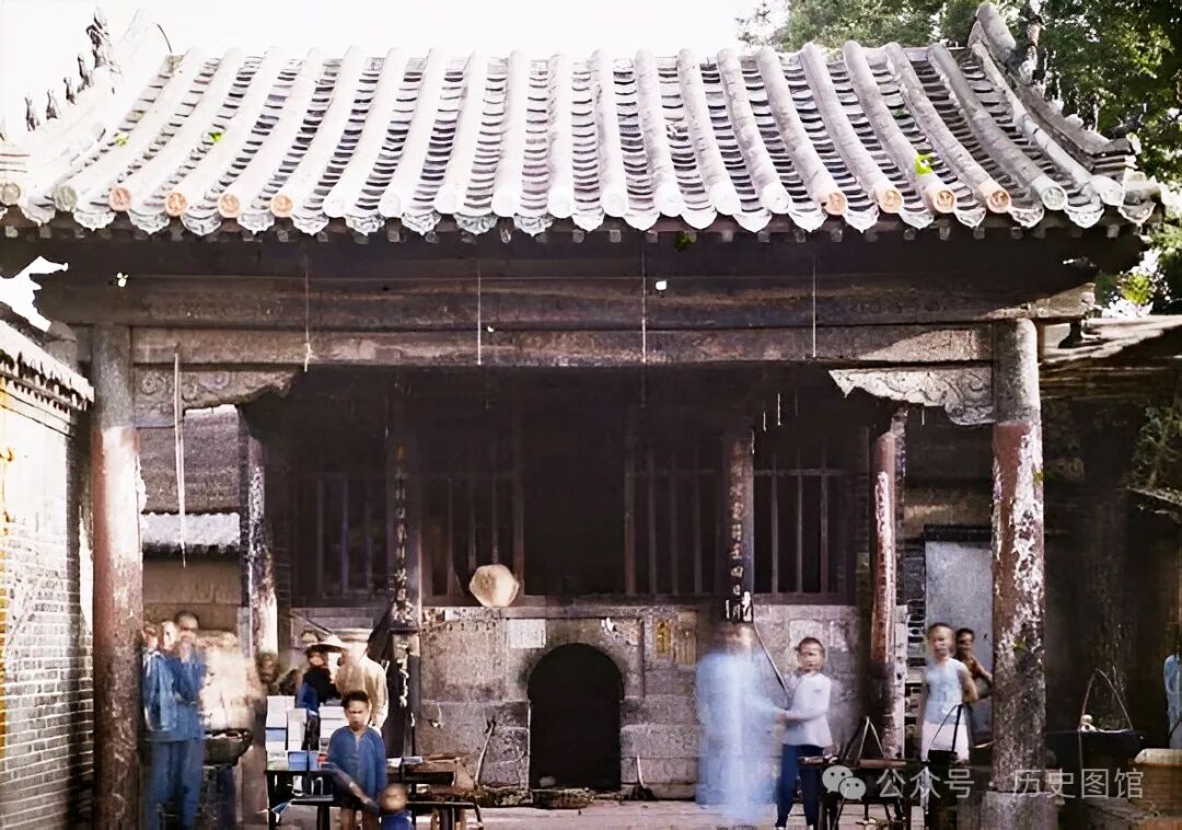 这张照片,看建筑的外观,像是当时的曲阜衙门。不过原来的照片并没有文字说明,也不能十分肯定。从这组照片,我们看到了100多年前曲阜的真实面貌。阳光照在古建筑上,人们的服饰,非常有年代感。