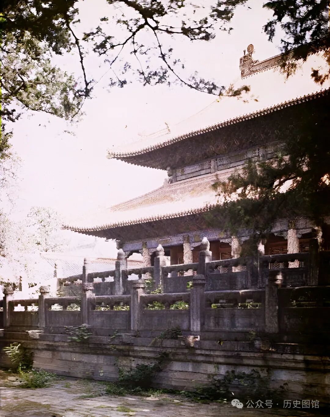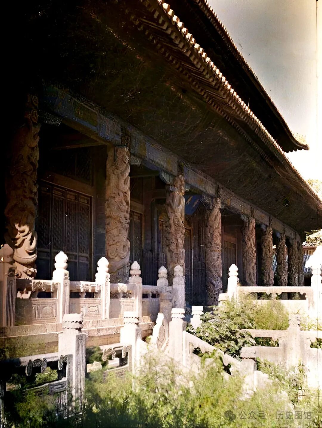 这四从另一个角度看大成殿,四周廊下环立28根雕龙石柱,非常气派。大殿四周设有双层的汉白玉石栏。只不过,100多年前孔庙里杂草丛生,石栏和平台上长满了杂草和灌木丛。