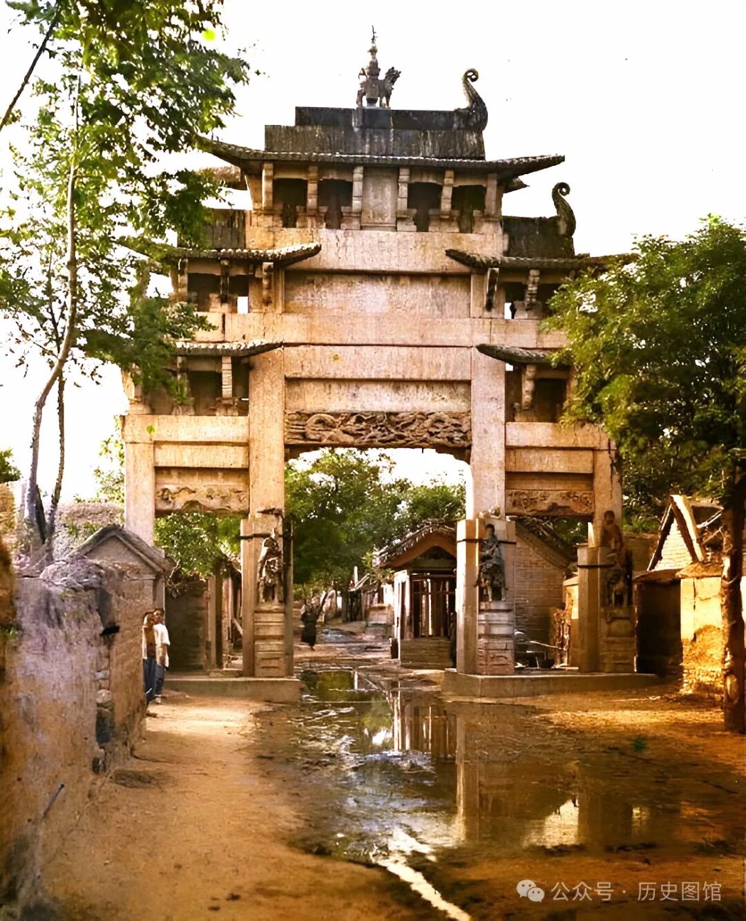 这张照片,拍摄于石牌坊的另一面。中间两根立柱前后,各有一尊骑着狮子的人物雕塑。牌坊下是一条小街,一眼望不到尽头。两侧是传统民居,还有一些草房,看上去古色古香。一场雨后,泥泞的街道上有很多积水。