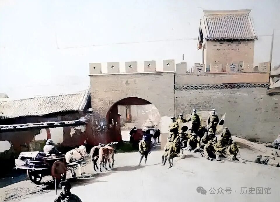 照片中这座城门,是30年代凌源的东城门——迎春门。在土地局楼西边,当时的凌源已被日军占领,十几名日军坐在城门口的石头上。城外百姓赶着马车进城,都要接受检查。