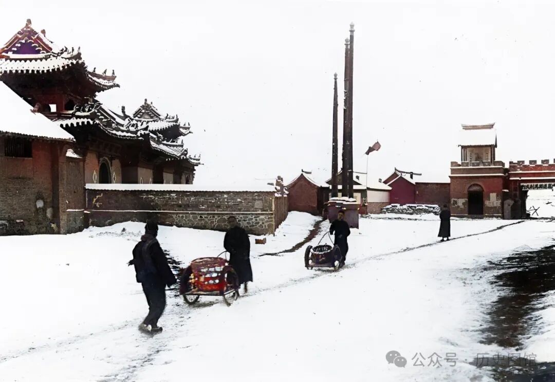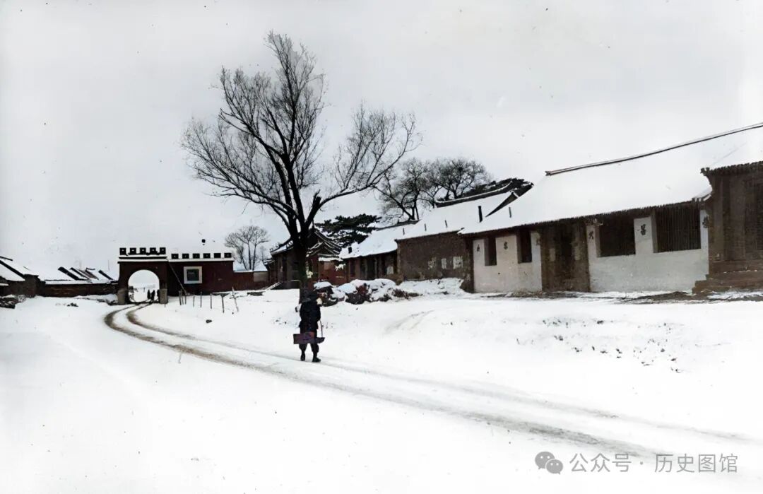 这张照片,拍摄于30年代的凌源县西门里面。房屋和道路被大雪覆盖,两条车辙伸向远处的西城门。照片中,大树后面被遮挡的古建筑,是当时凌源县的城隍庙所在地。