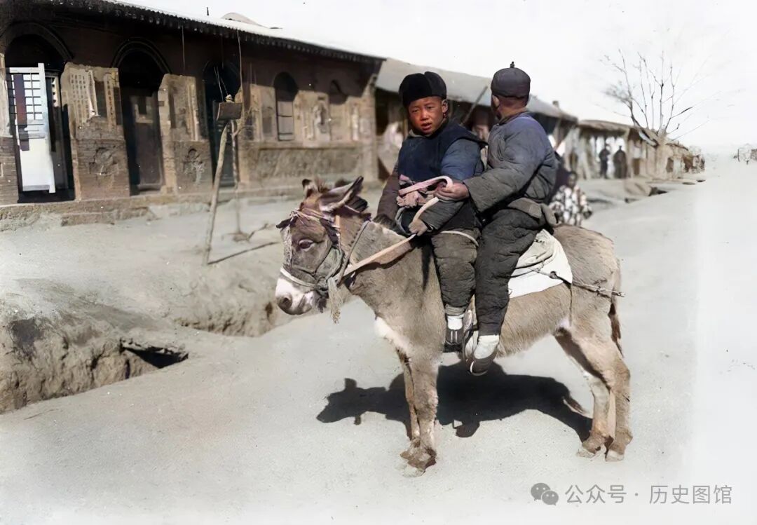 这张照片,拍摄于30年代的朝阳建平县。在一条街道上,两个男孩到县城赶集,他们骑在一头小毛驴身上,手紧紧拉着缰绳。一看就是骑驴的高手。