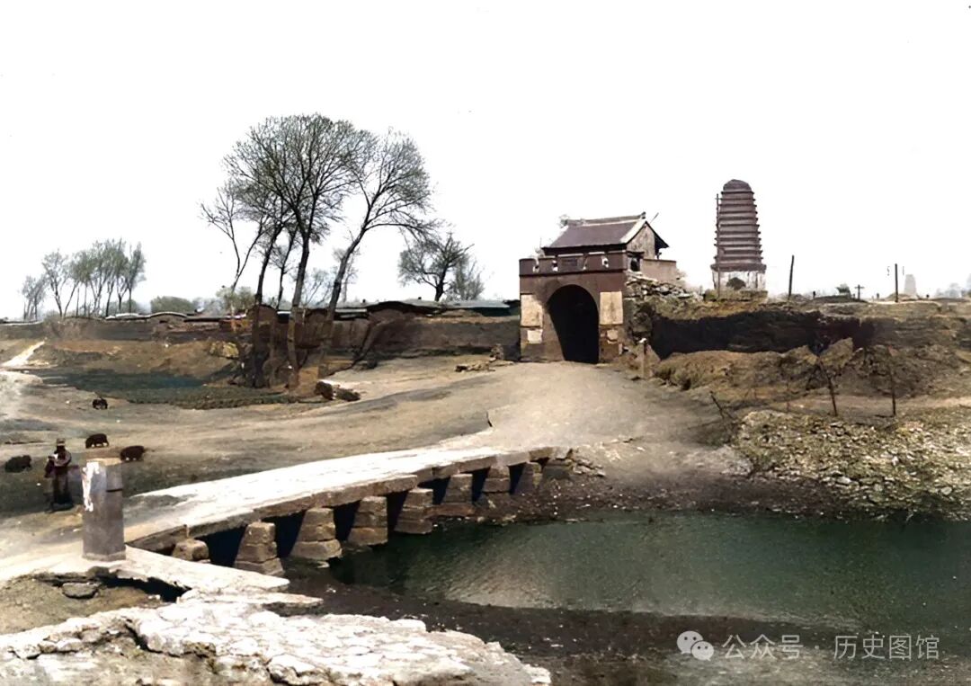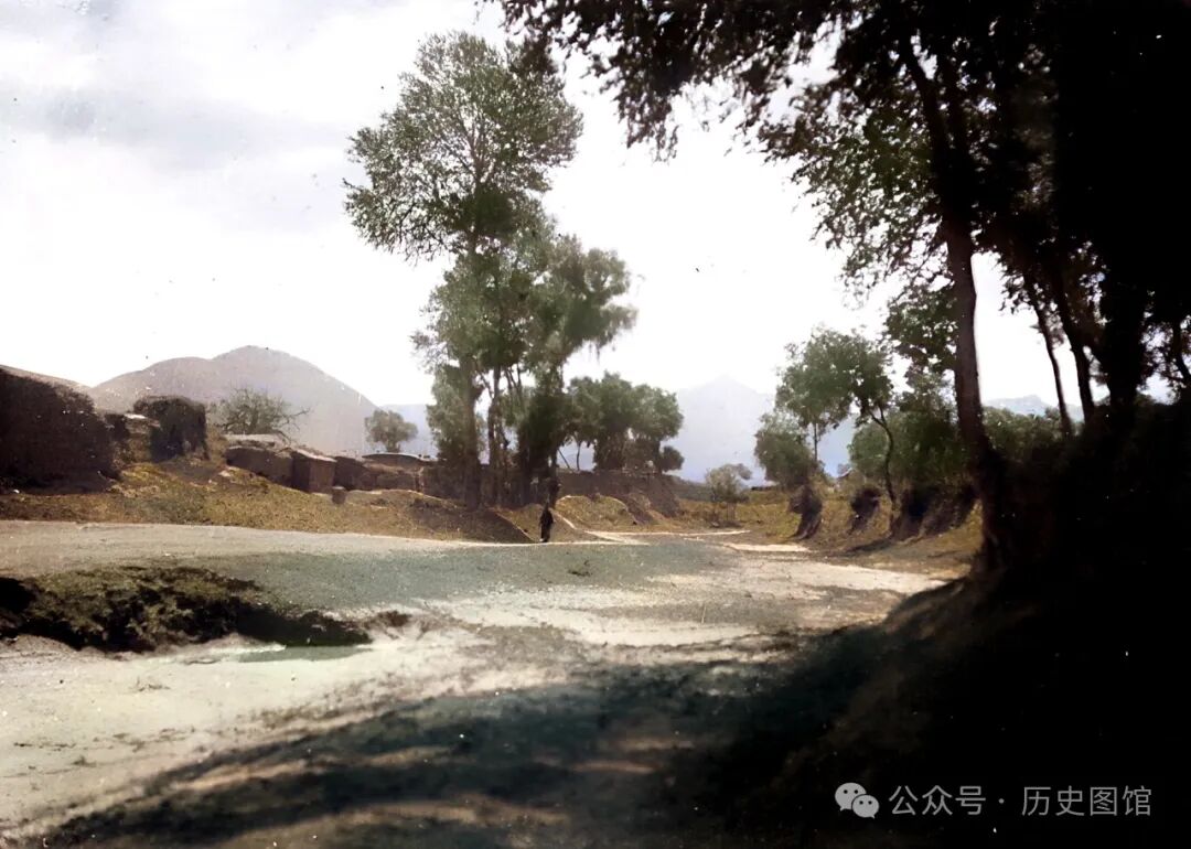 1935年,朝阳城外景象。一条干涸的河沟,常年的人车行走,成为了一条大路。路两侧有民居建筑,以及庄稼地。远处,一座座大山在薄雾中时隐时现。画面处处透露着田园气息。