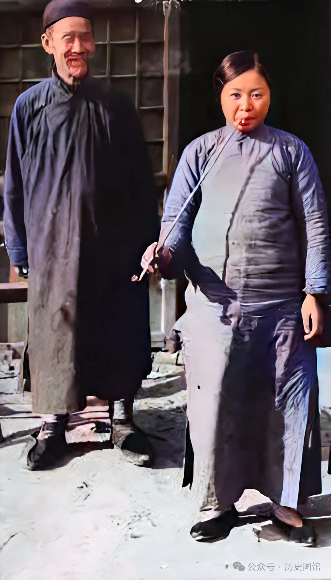 30年代,朝阳市城内一个胡同里,一名年轻女子站在家门口。她学着男子的样子,手拿一根长烟袋锅,摆出一副吸烟的动作,真是太形象了。