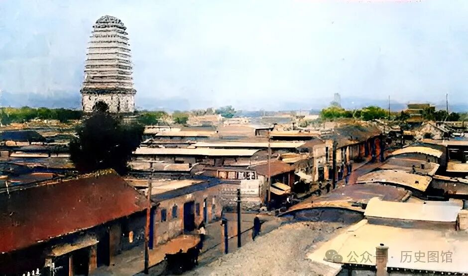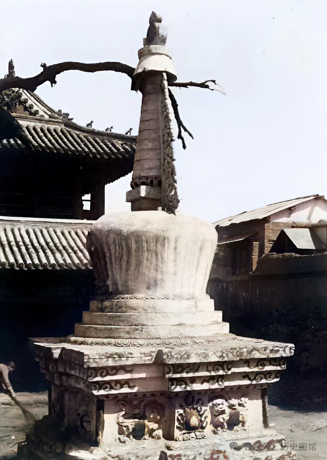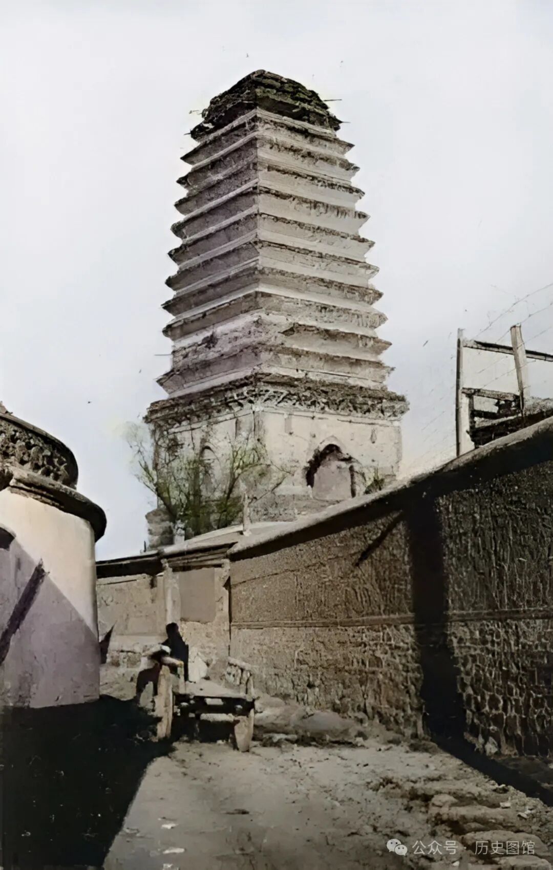 塔身四面各雕有一尊坐佛,端坐于莲花座之上。北塔现为全国重点文物保护单位。照片中,一名男子赶着马车从北塔下的小胡同里经过。
