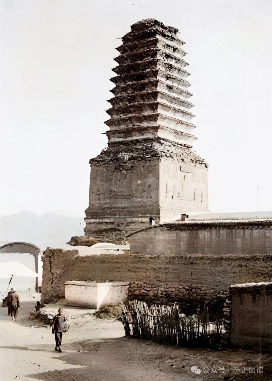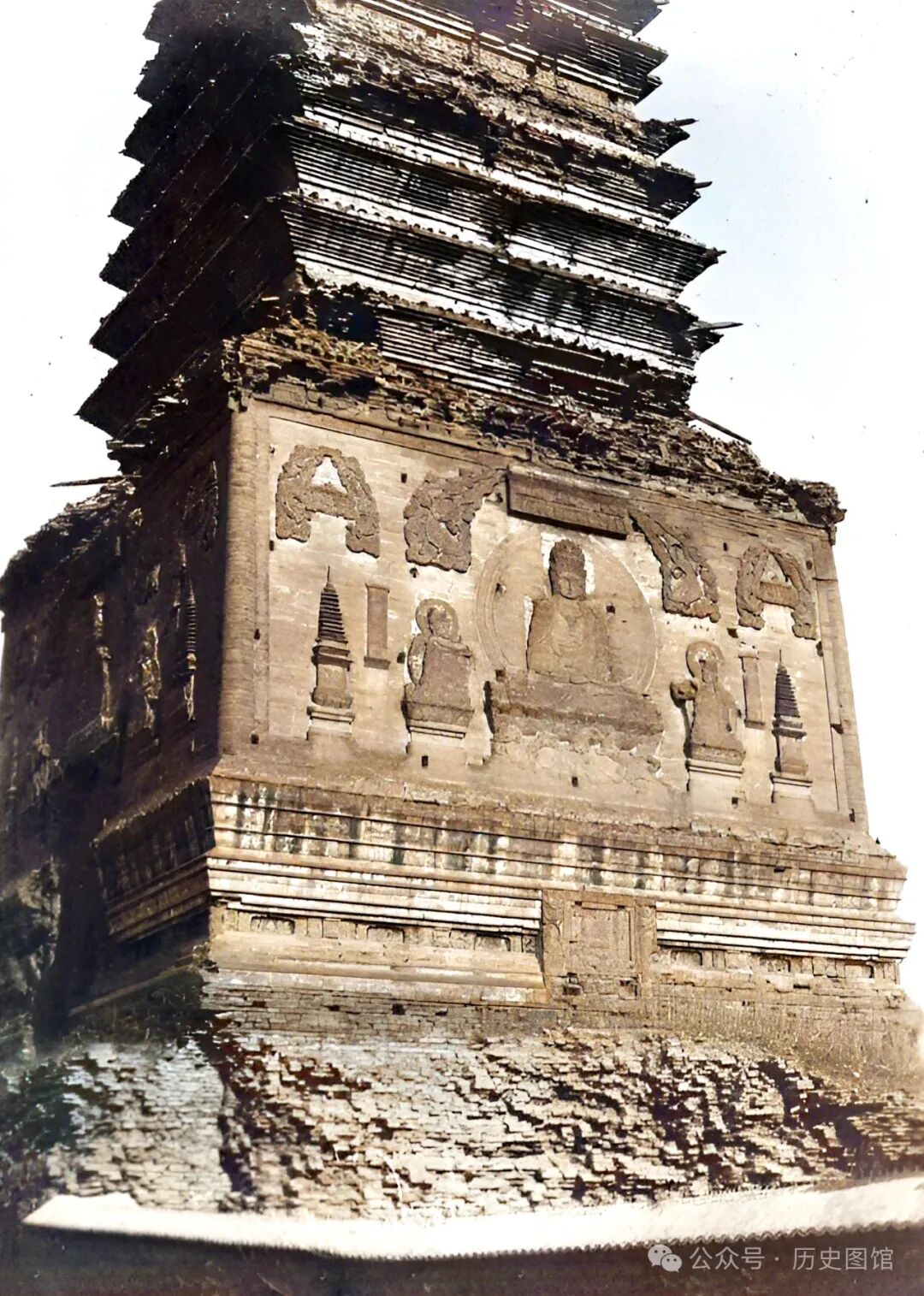 这是30年代北塔的局部图。塔身南面有券门,可通塔心室。其他三面,各设有一个假门。塔身四面共有八塔八碑十二佛。北塔对研究佛教艺术和历史具有极为重要的价值。