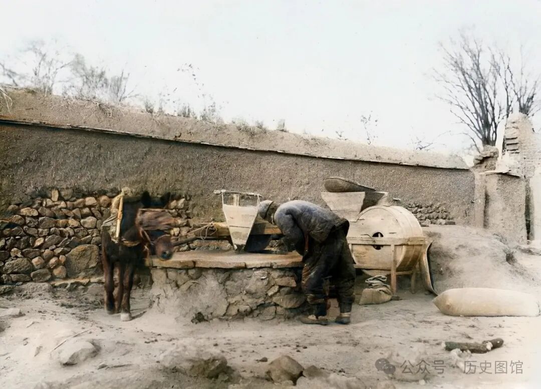 1934年,早朝阳一个农家院内,一名当地人正在磨谷物。一头小毛驴蒙着眼睛,围着圆形的碾盘转圈,碾盘上的石磙将谷物碾压成面粉。