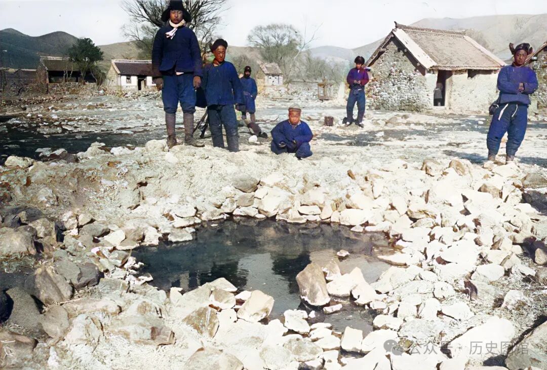 1934年,凌源县北郊热水汤。人们站在一个用石头围起来的水池前。池水不断向外冒着热气,这就是当时位于凌源县的一处露天温泉。